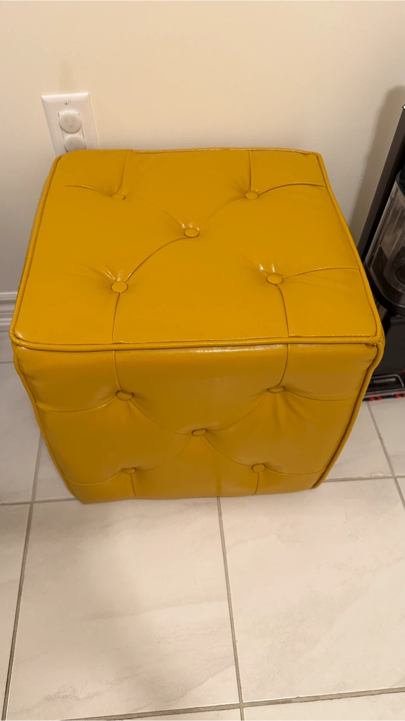 This is a bright yellow ottoman with tufted detailing all around. It's a square shape and can be used as a footrest or extra seating. Adds a pop of colour to any room!