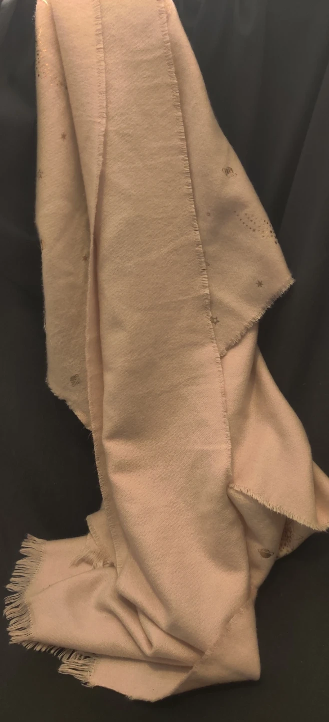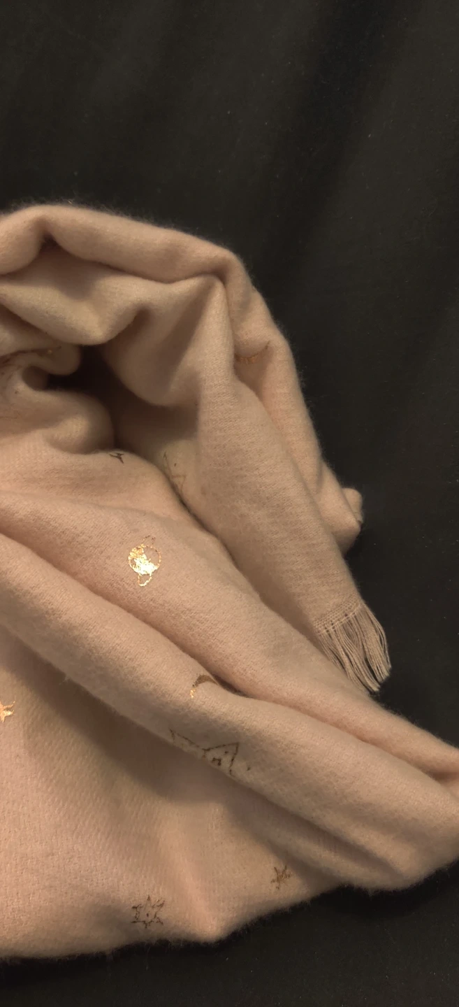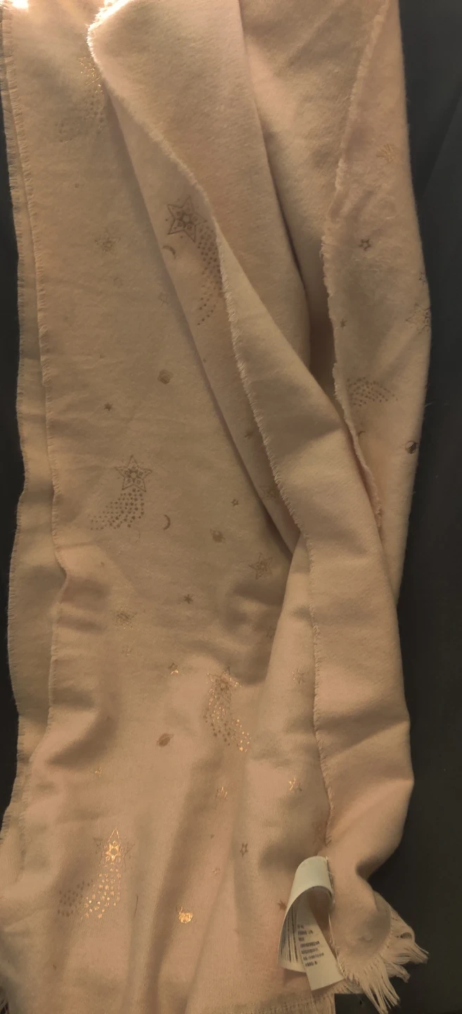A soft, pink scarf with gold star and moon accents. It has fringed edges and a comfortable feel. Perfect for adding a touch of sparkle to any outfit!Scarf is long and wide