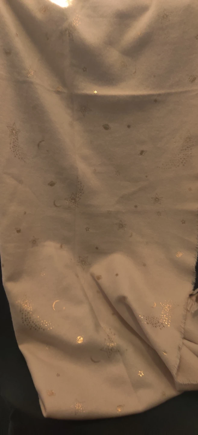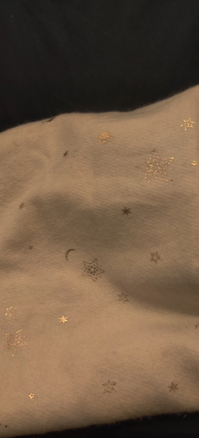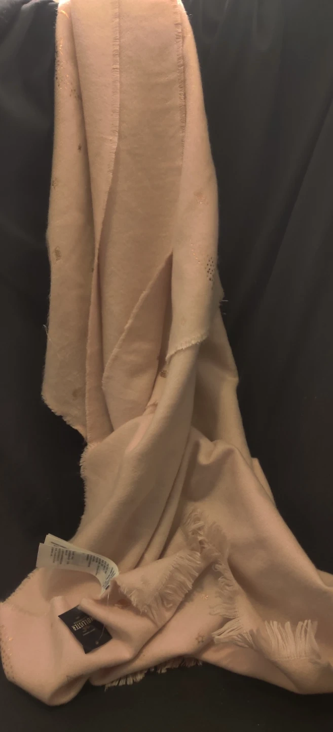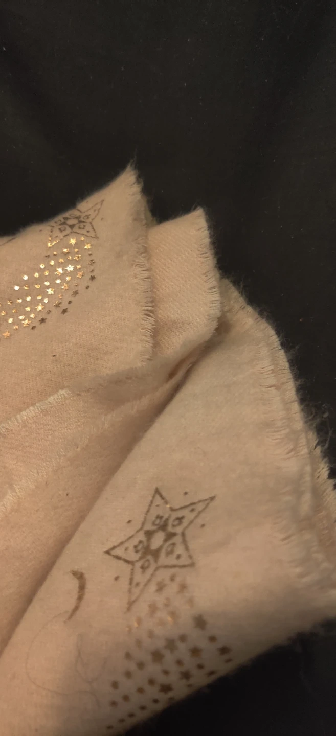 A soft, pink scarf with gold star and moon accents. It has fringed edges and a comfortable feel. Perfect for adding a touch of sparkle to any outfit!Scarf is long and wide