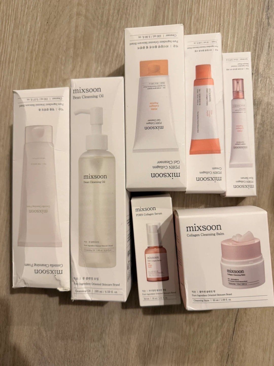 This lot includes various Mixsoon skincare products. You'll find a Bean Cleansing Oil (195ml), Collagen Cleansing Balm (50ml), PDRN Collagen Serum (30ml), PDRN Collagen Cream (50ml), PDRN Collagen Gel Cleanser (100ml), and Centella Cleansing Foam. It's a great way to try several of their popular items!