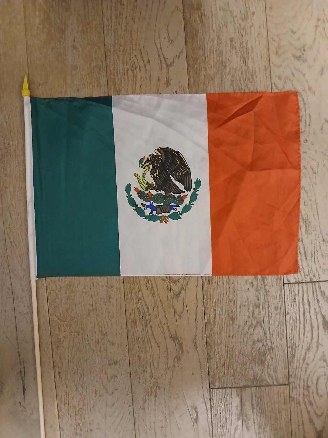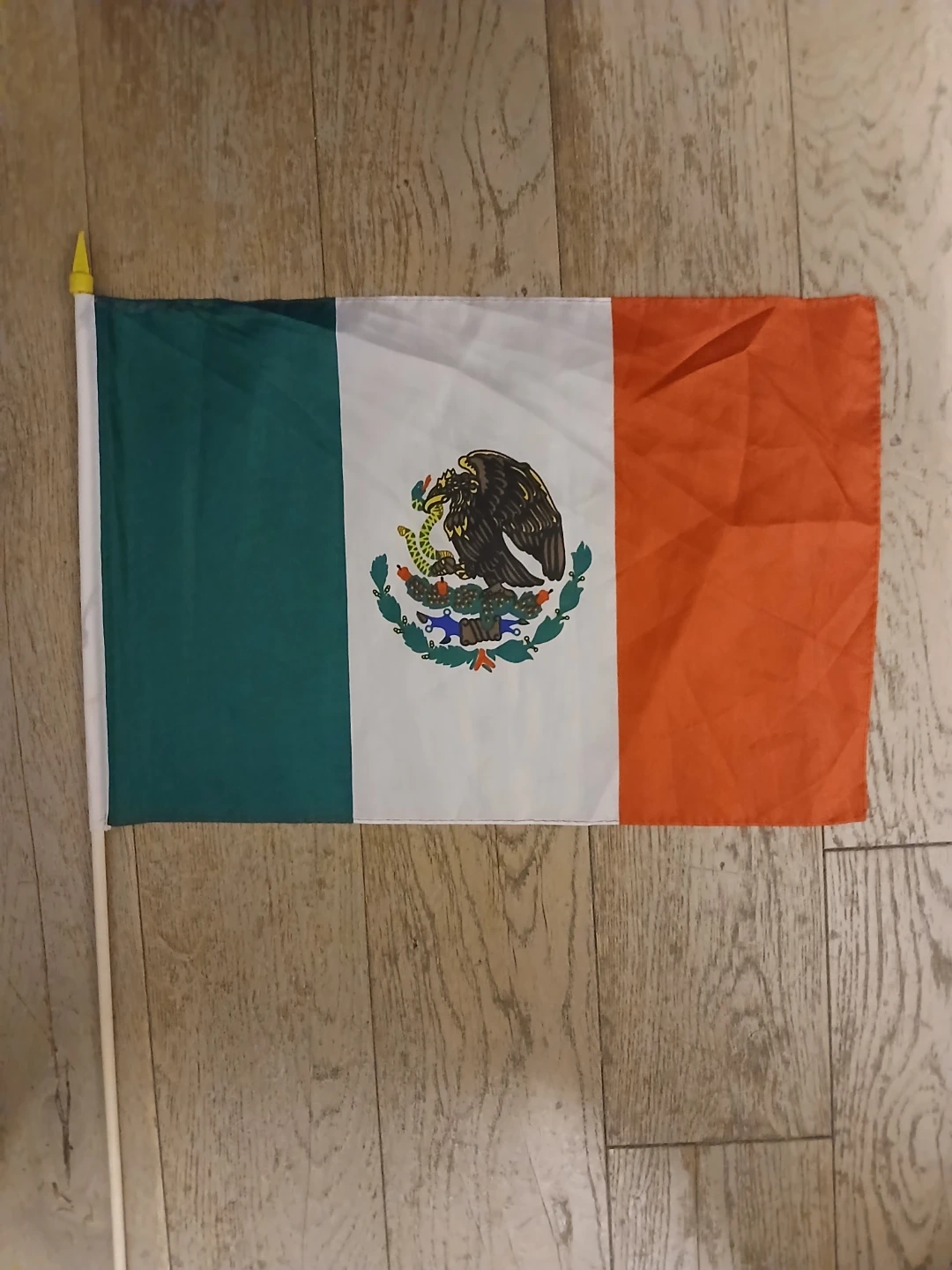 This is a Mexican flag. It features the national coat of arms on a white field between a green and a red stripe. The flag comes with a wooden pole. It's about 24 inches wide and 16 inches tall.