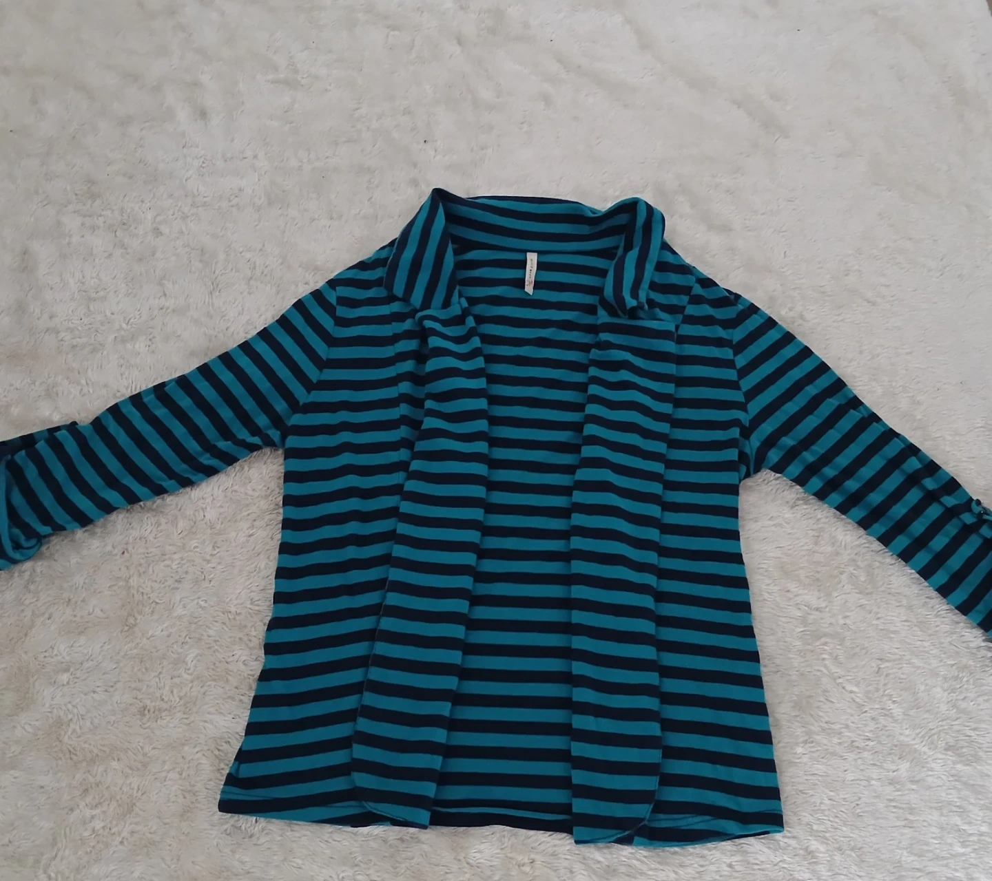 Here's a comfy striped cardigan in teal and black! It's perfect for layering and adding a pop of colour to your outfit