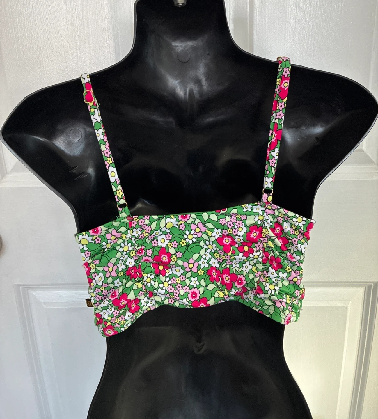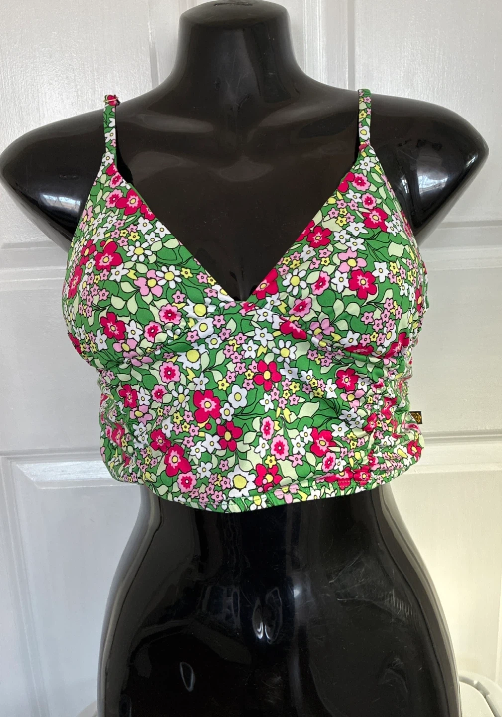 This cute green crop top features a vibrant all-over floral print with pink and yellow accents. It's designed with adjustable spaghetti straps and a ruched side detail. This top is perfect for warm weather or layering!