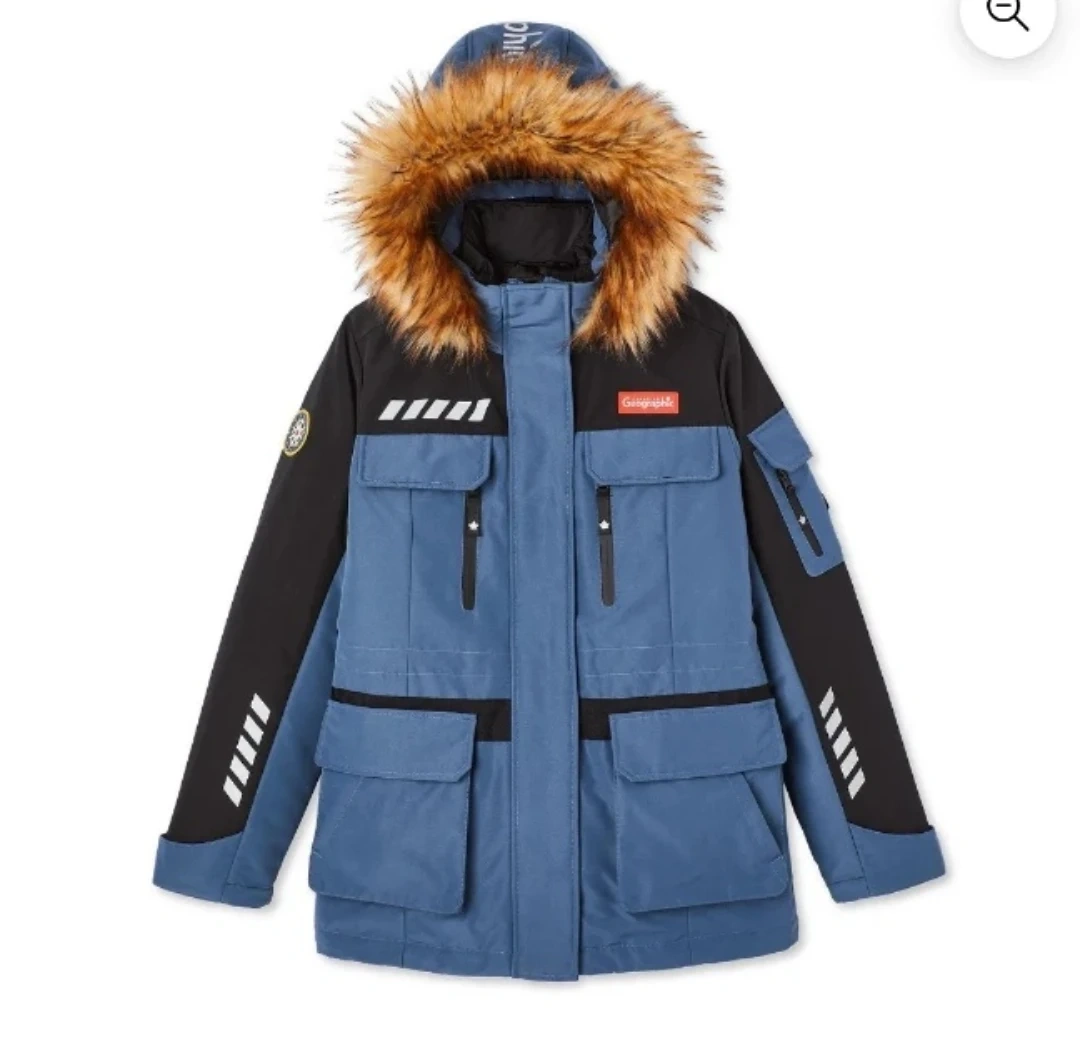 This Geographic parka jacket is blue with black accents and a faux fur-lined hood. It features multiple pockets and reflective detailing on the sleeves. Great for staying warm!