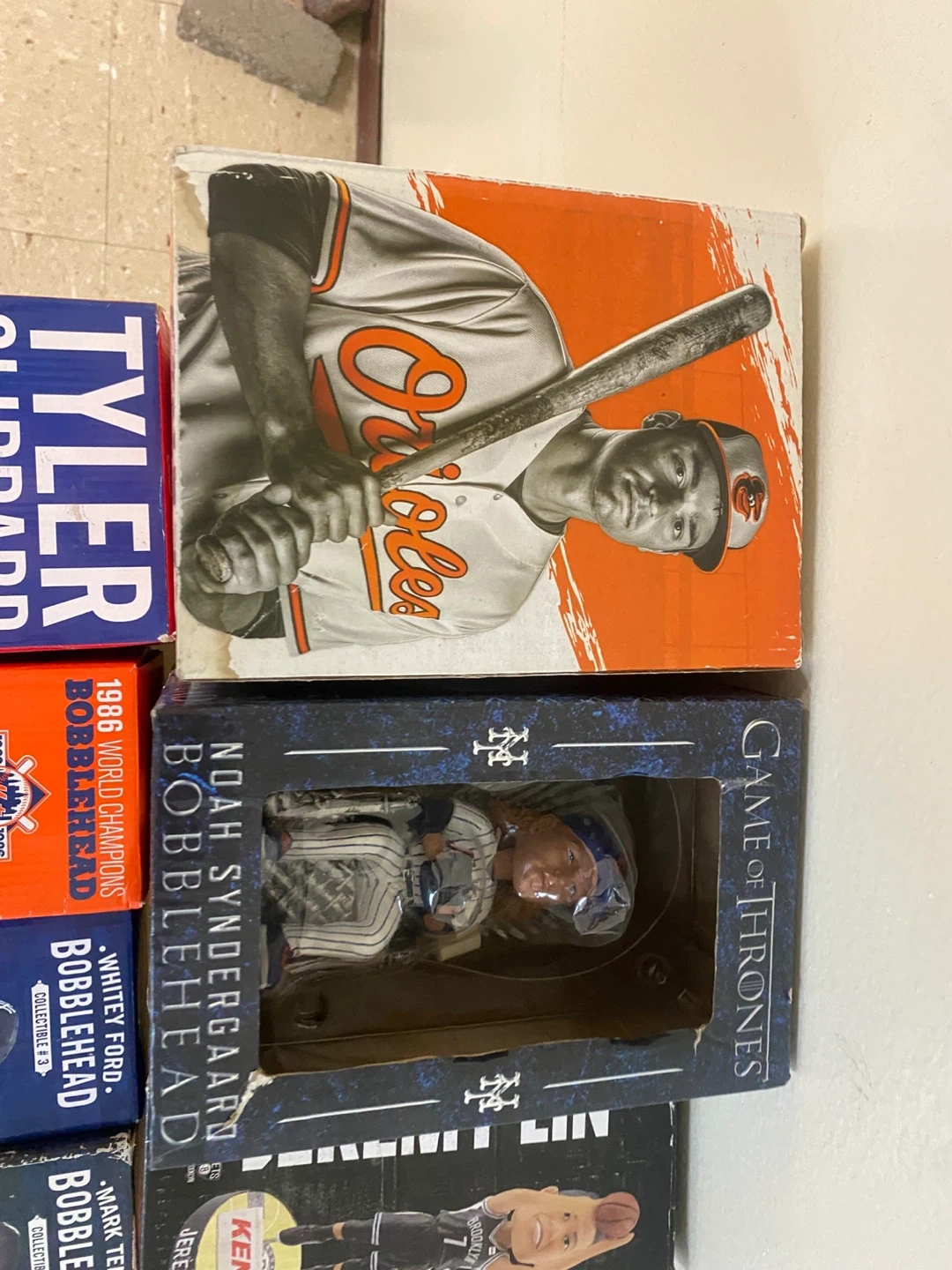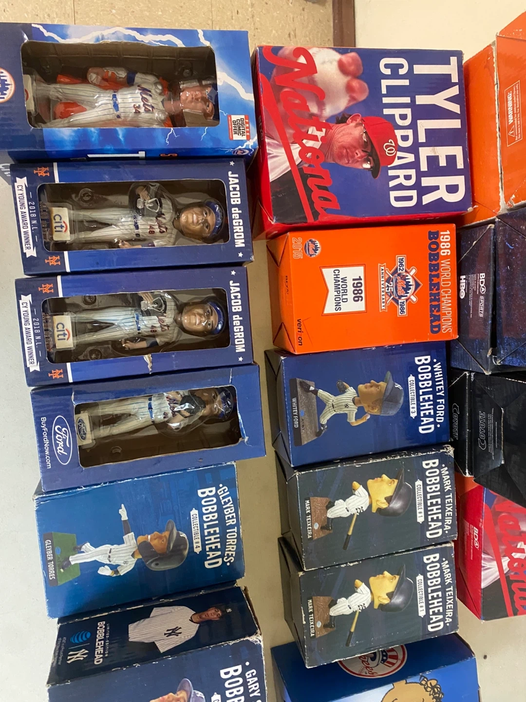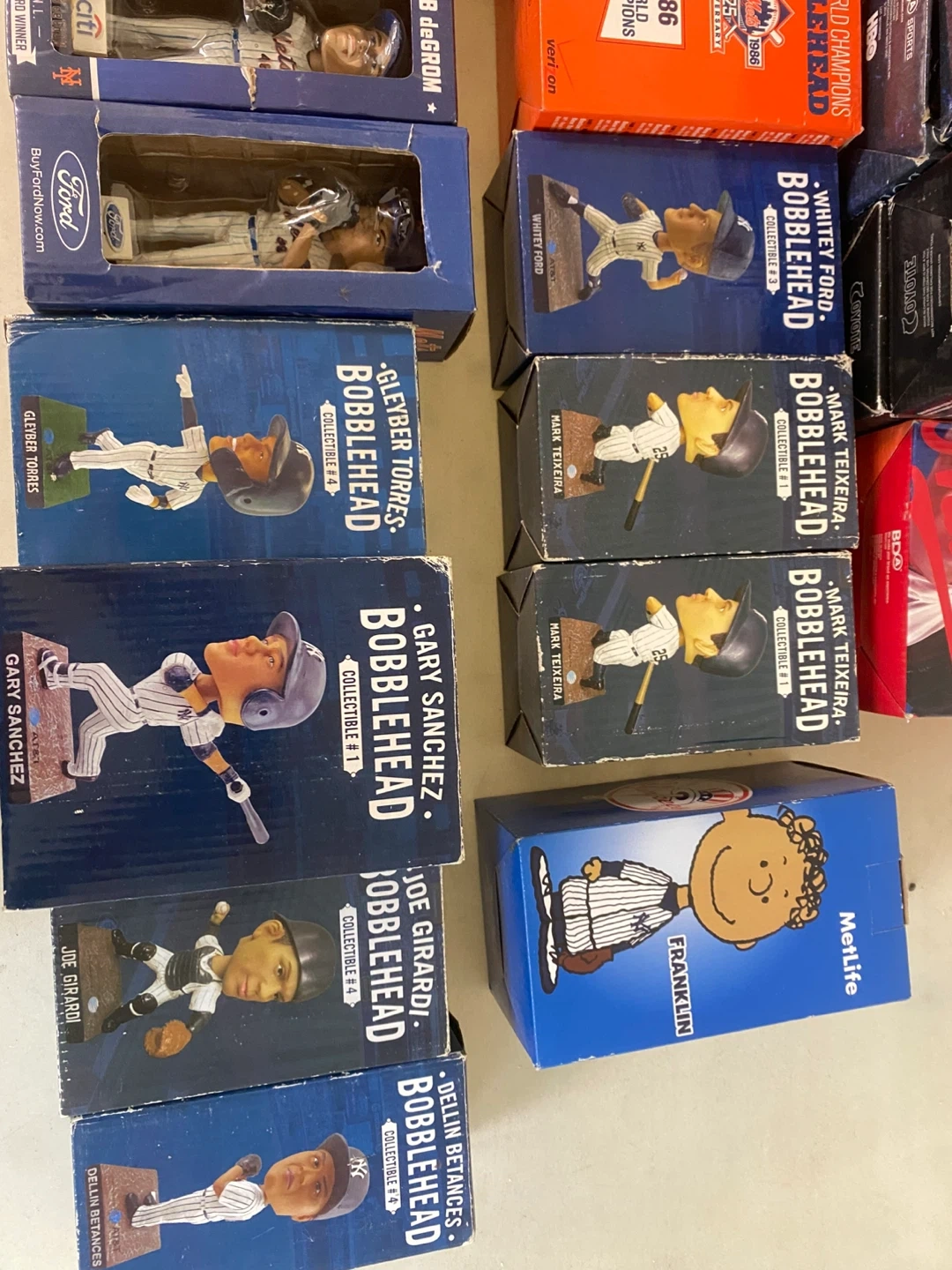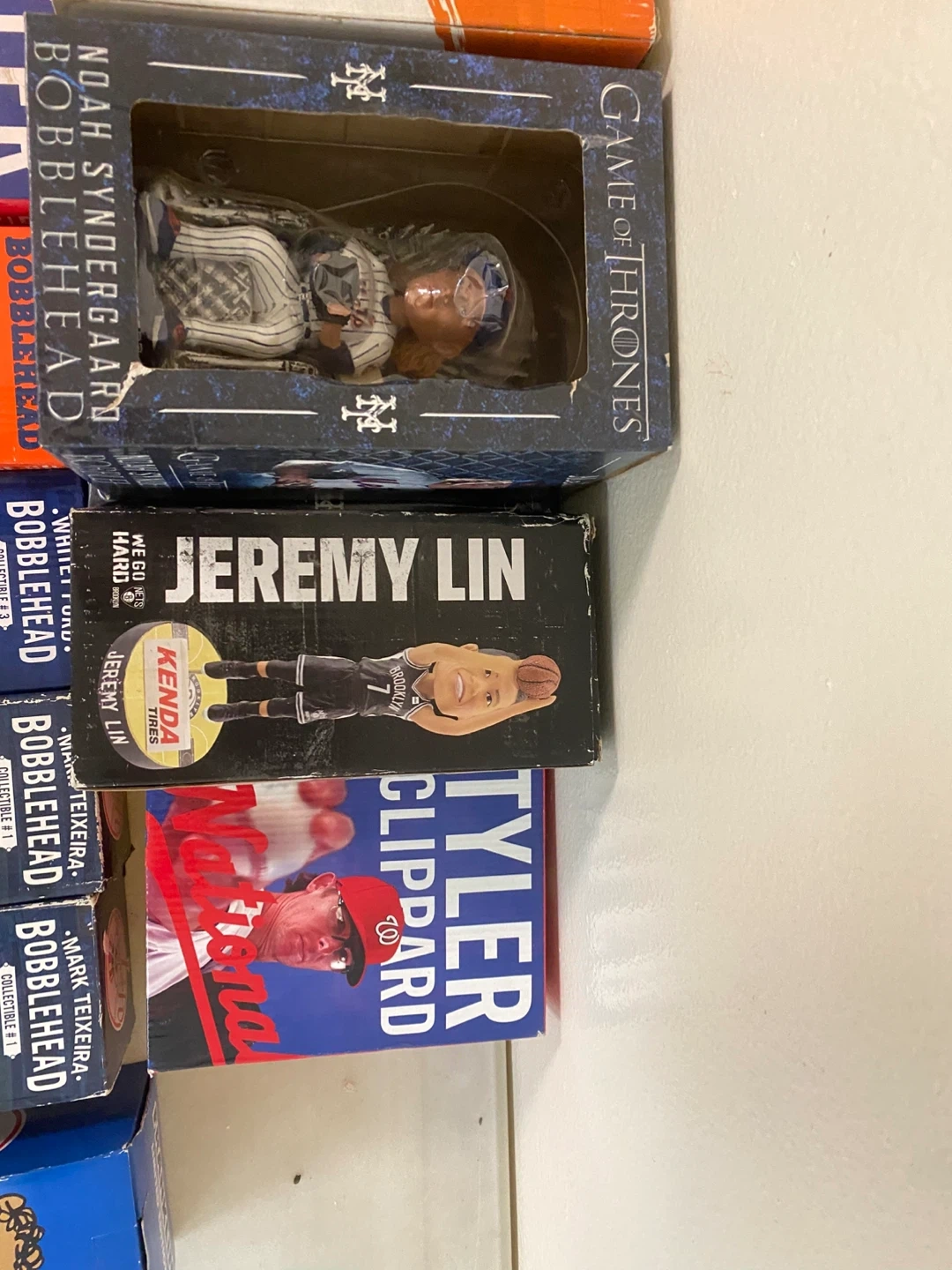 Collection of various bobblehead figures including MLB players like Tyler Clippard, Noah Syndergaard, and Gary Sanchez. Also includes a Jeremy Lin basketball figure and a Peanuts Franklin collectible. Most are in original boxes. These are great for sports memorabilia collectors!