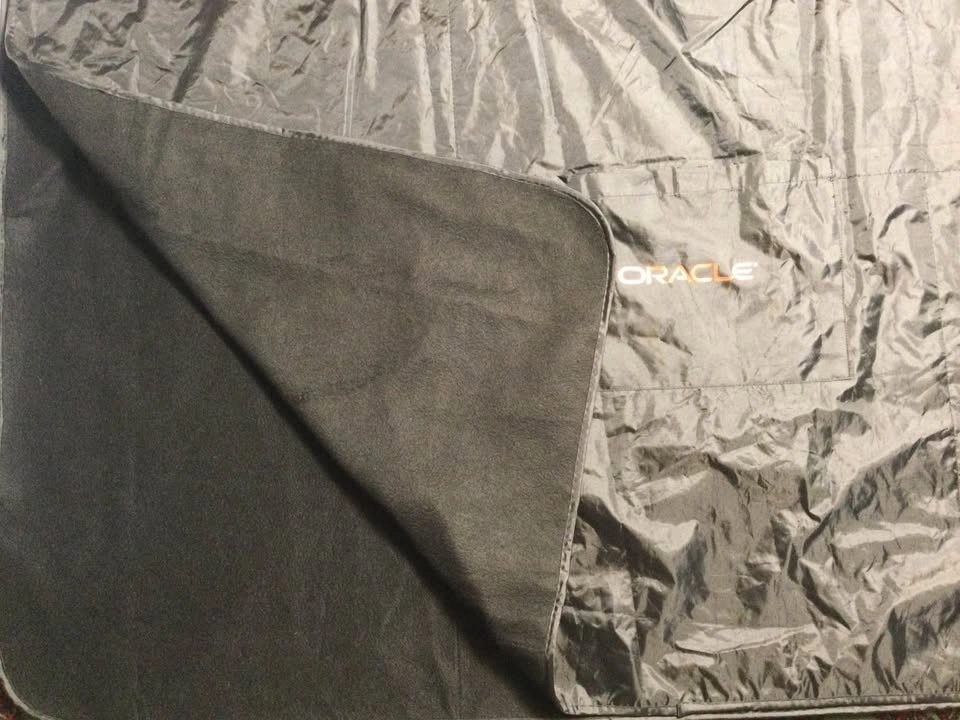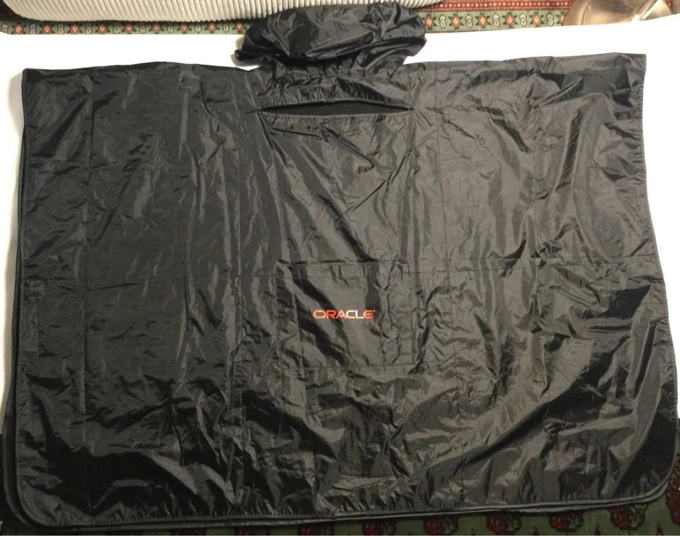 Lightweight fleece lining snow rain blanket poncho with hood and front pocket. Adult size. Oracle logo. Dimensions: 52” wide, 37” length. Available for cash and pickup in Manhattan / Hell's Kitchen.