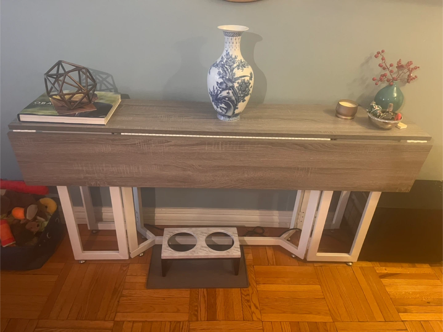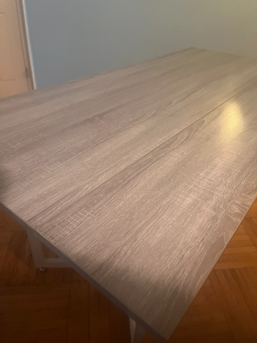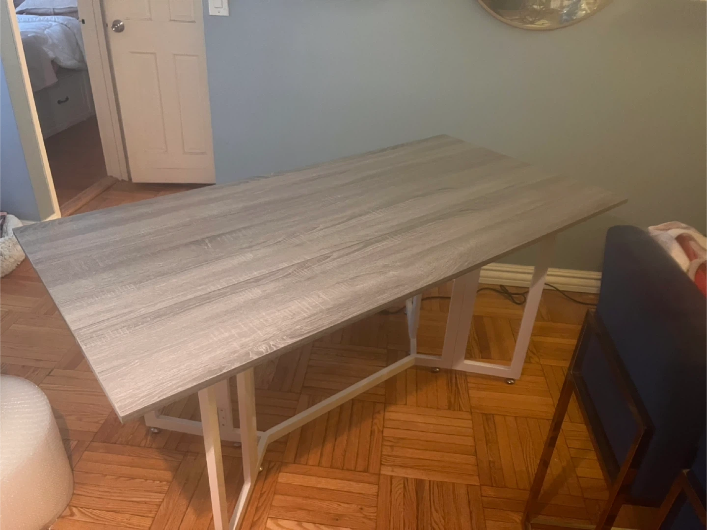 This drop leaf dining table offers a gray wood grain finish with white metal legs. Its sides can be folded down to save space when not in use. This table's design makes it versatile for various dining or work needs.