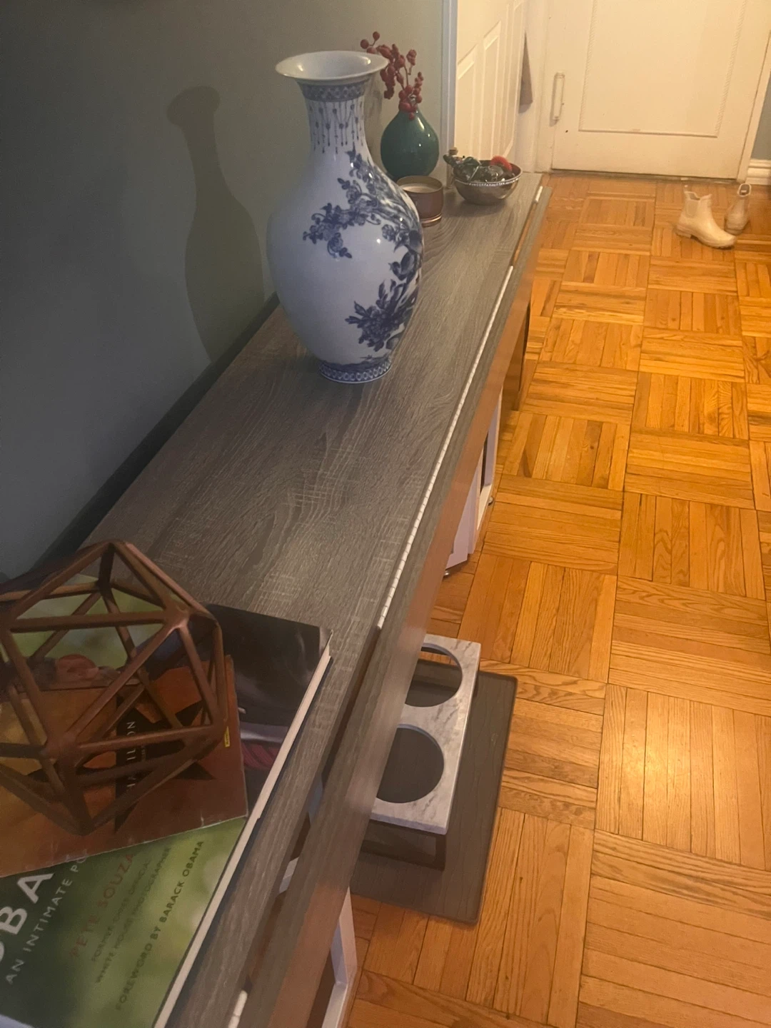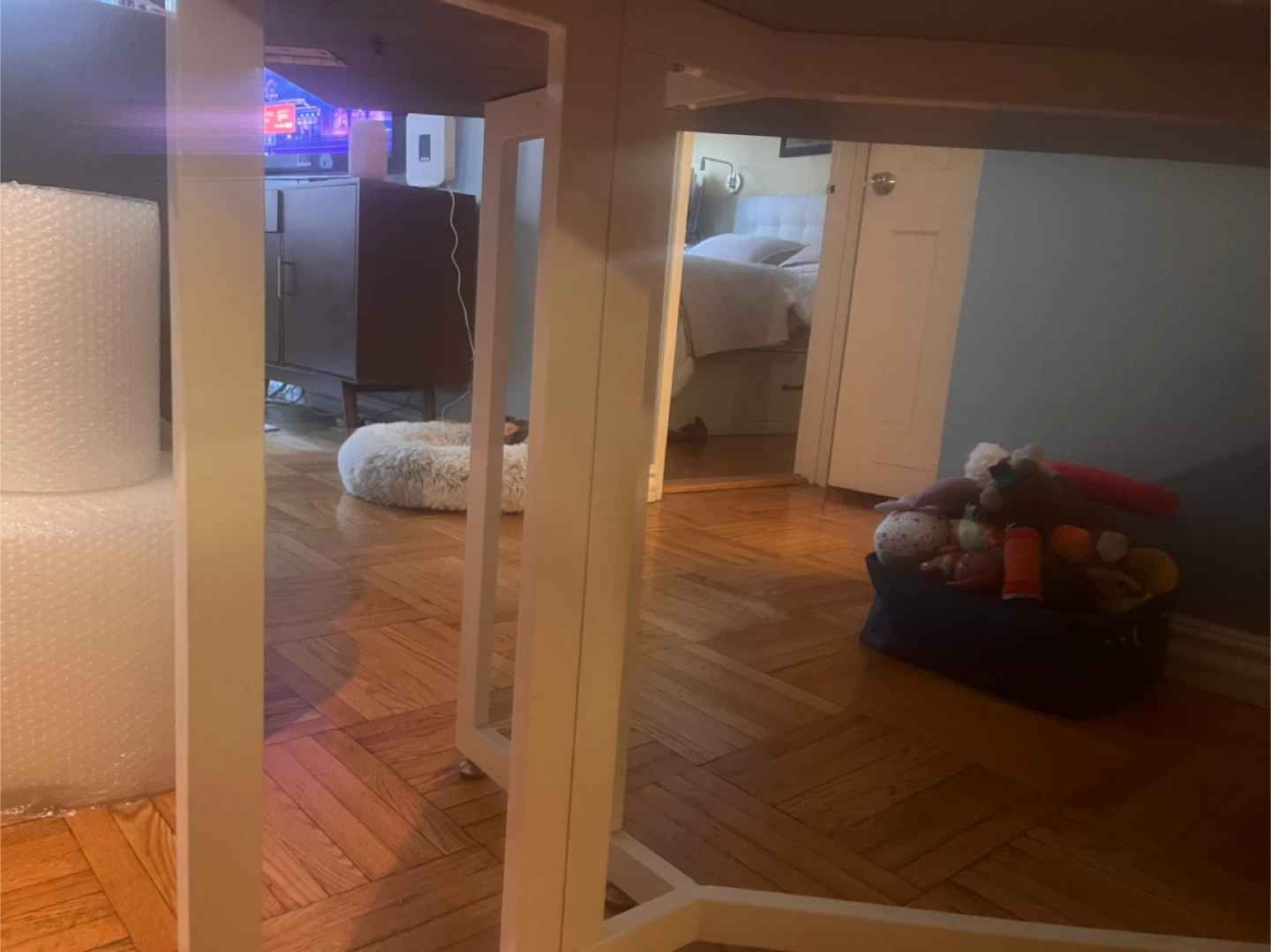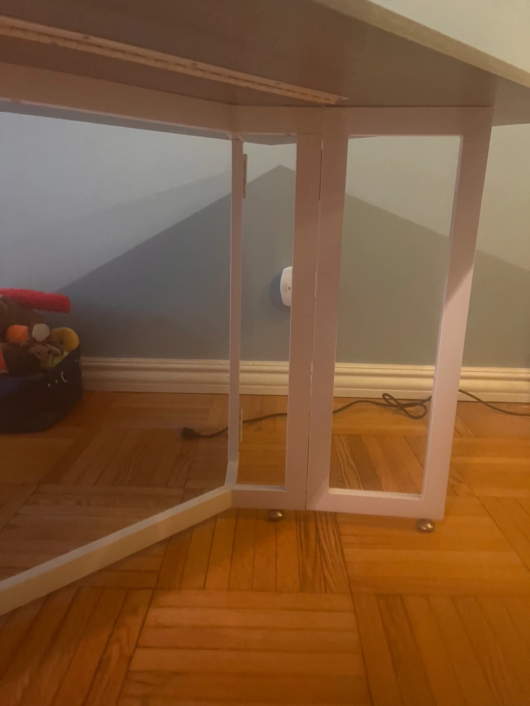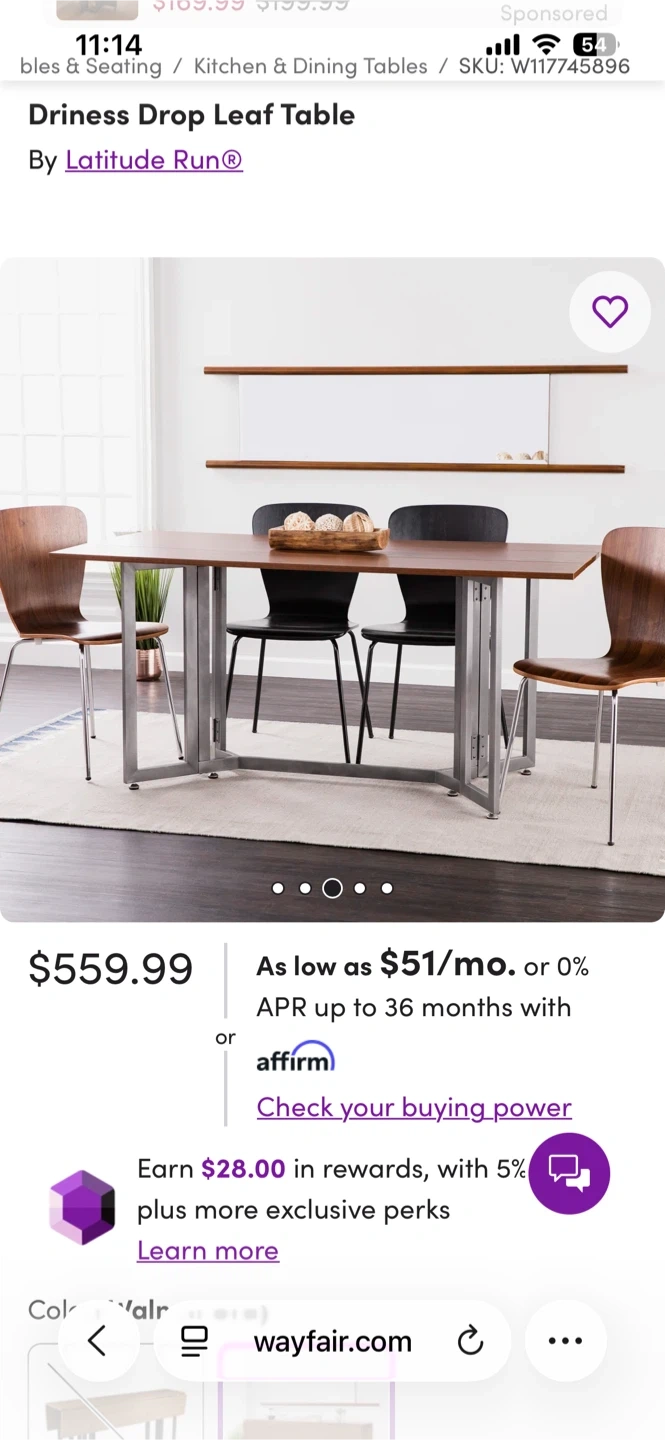 This drop leaf dining table offers a gray wood grain finish with white metal legs. Its sides can be folded down to save space when not in use. This table's design makes it versatile for various dining or work needs.