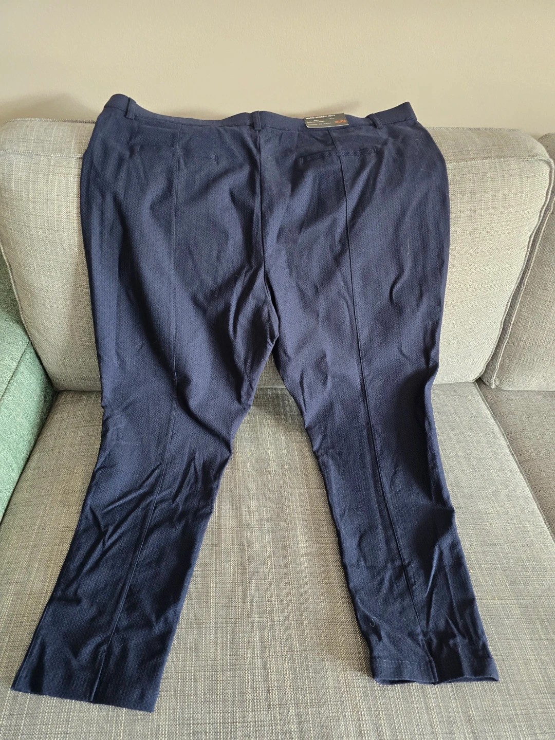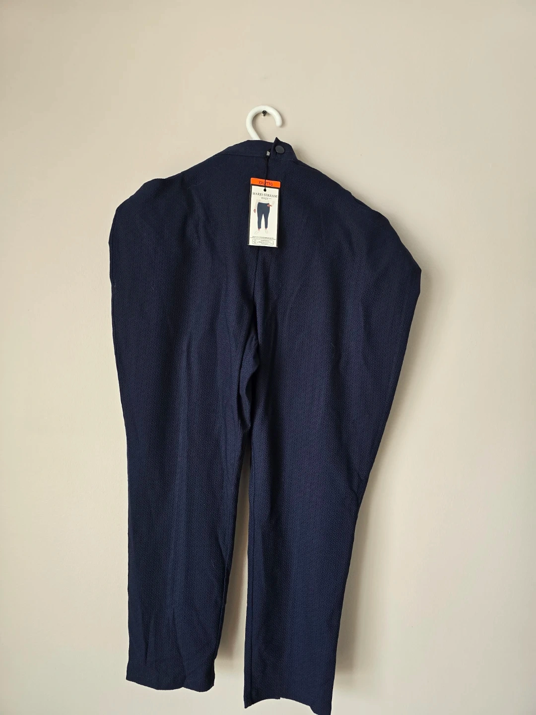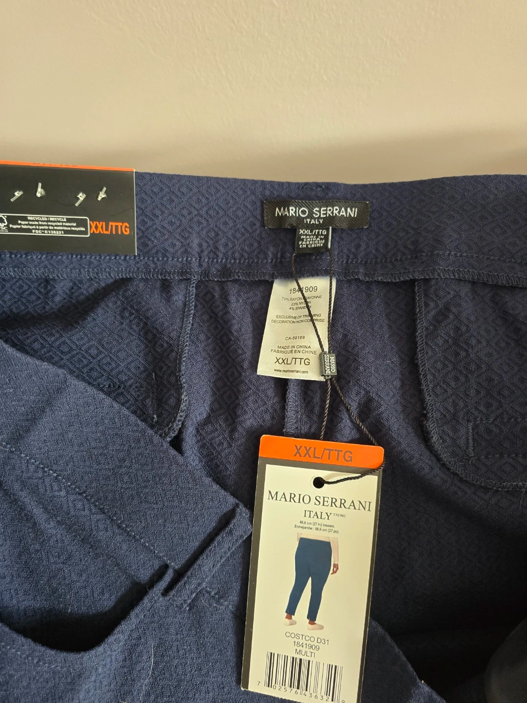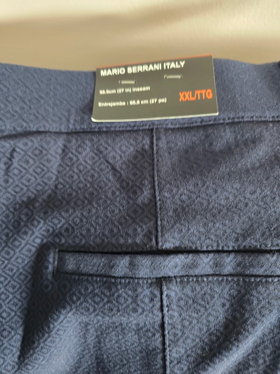These are Mario Serrani Italy navy patterned pants. They are a size XXL/TTG with a 27 inch inseam. The fabric is 71% rayon, 26% nylon, and 3% spandex.