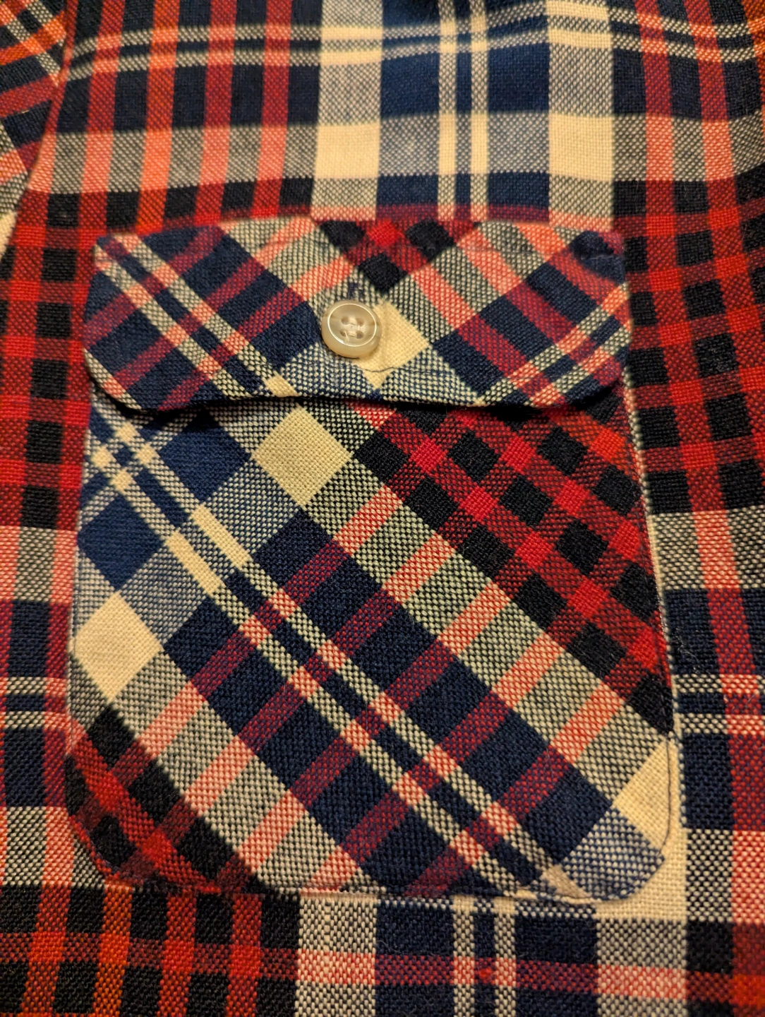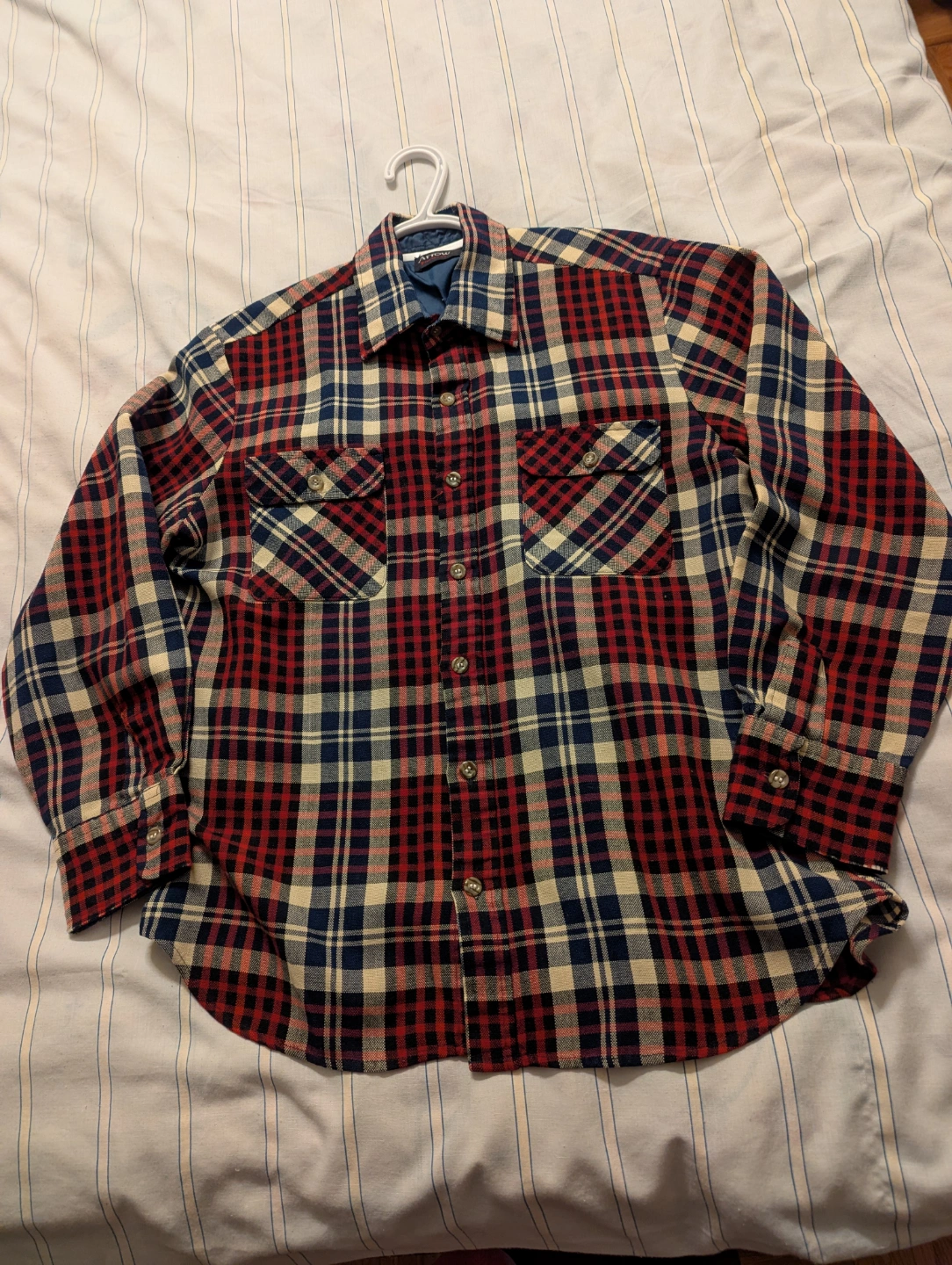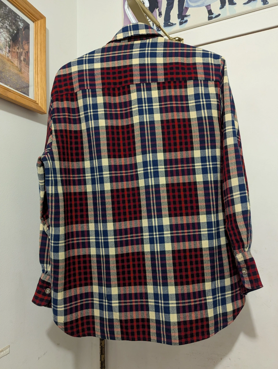 Unisex long-sleeve shirt. Red, blue, and beige plaid pattern. Two chest pockets. Button closure. Excellent condition. Men's size Small or women's size Medium.