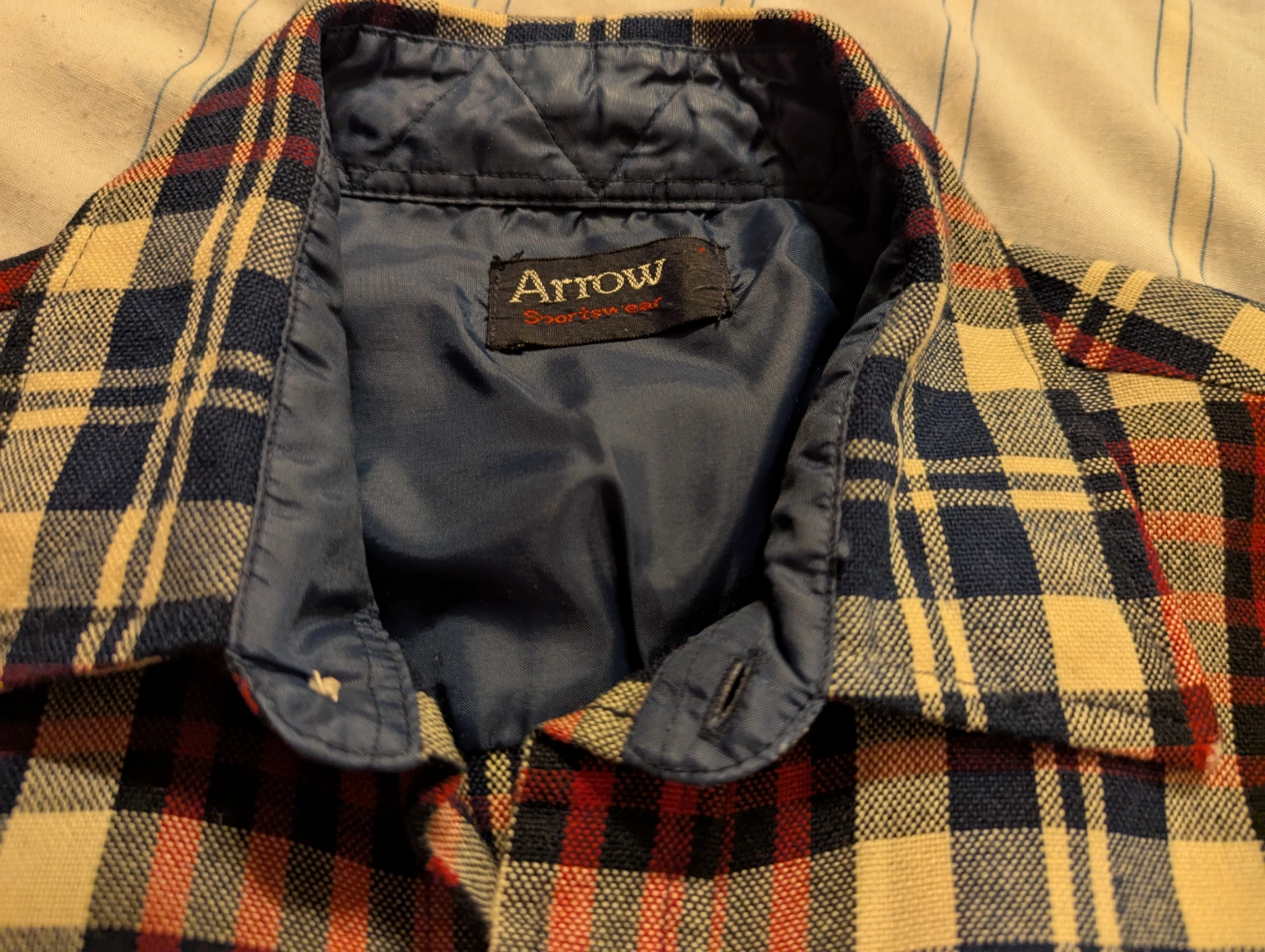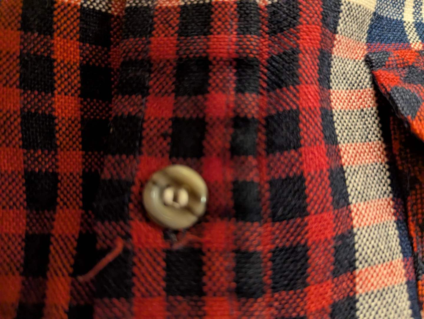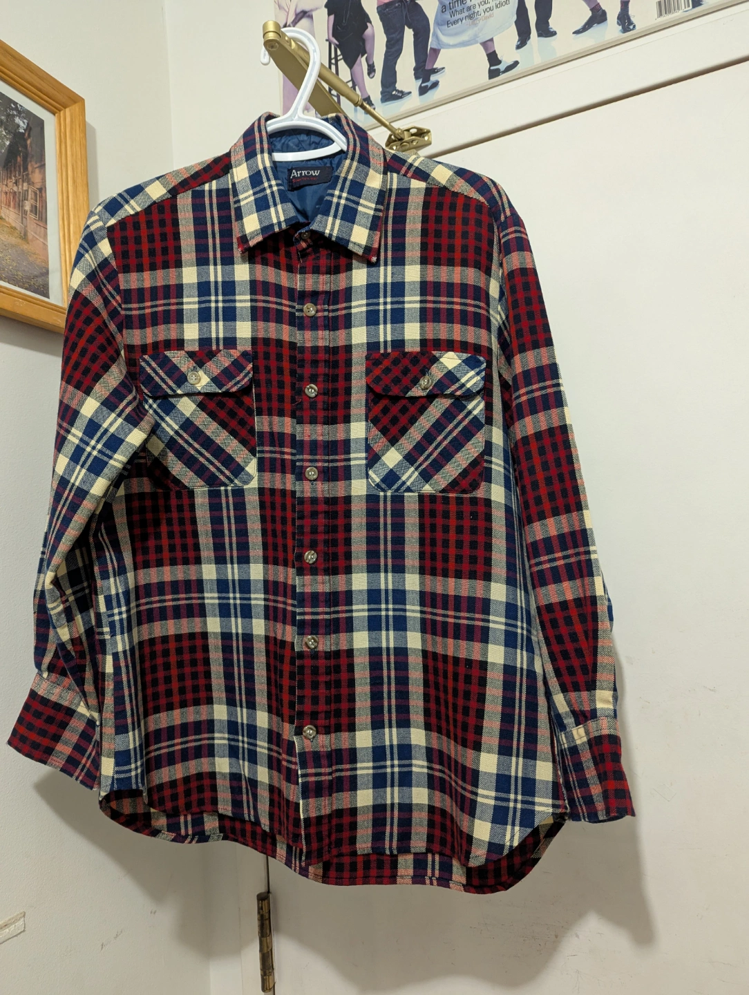 Unisex long-sleeve shirt. Red, blue, and beige plaid pattern. Two chest pockets. Button closure. Excellent condition. Men's size Small or women's size Medium.