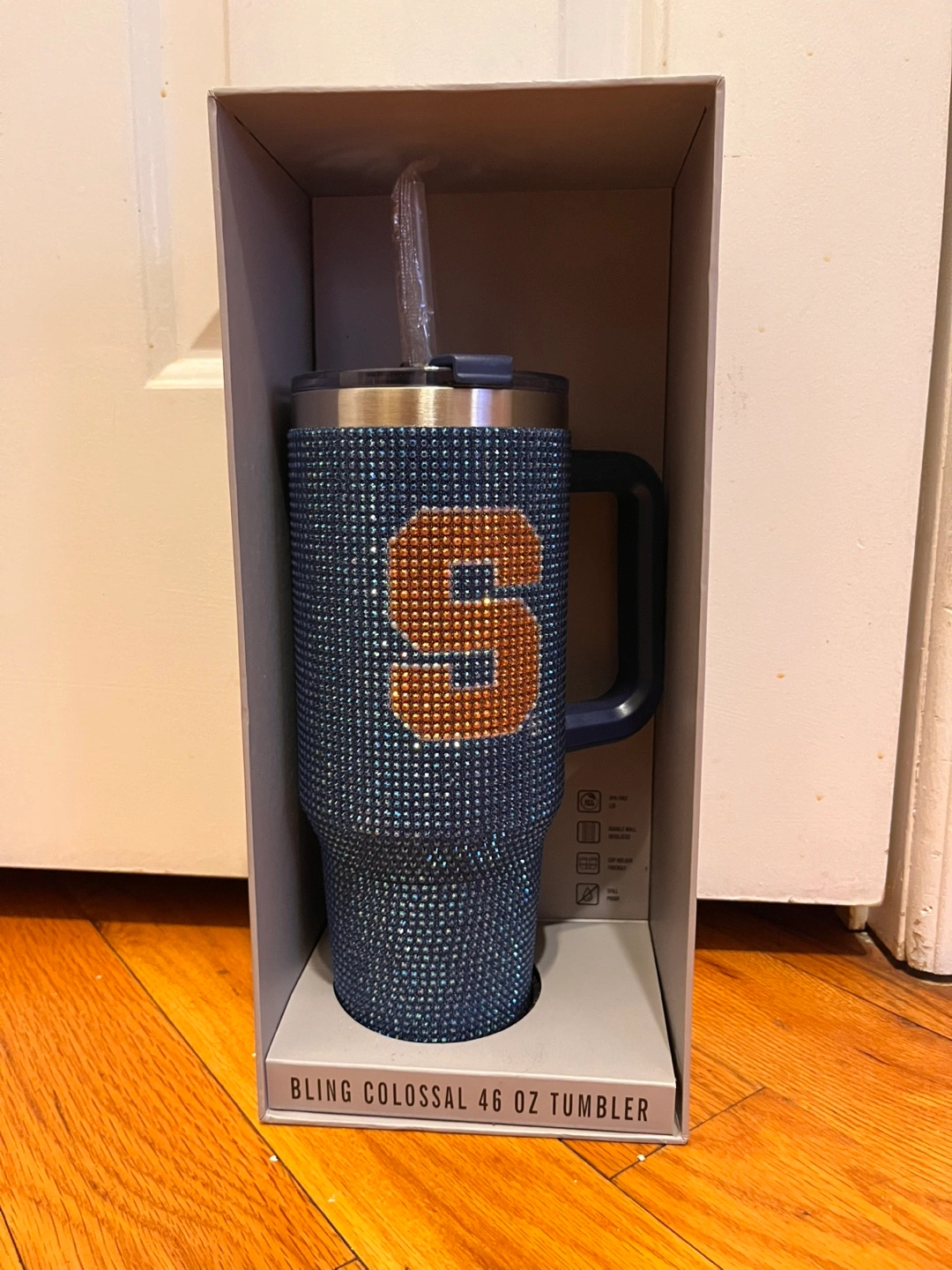 46 oz stainless steel tumbler. Double walled and insulated. BPA free. Spill proof. Cup holder friendly. Copper lined. Features a large letter S in rhinestones.
