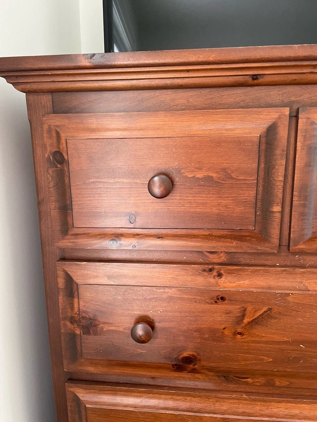 This is a solid wood dresser with a warm, reddish-brown finish, featuring six drawers for ample storage. It's a pre-owned item, showing some signs of wear that add to its character. Previously stained but can also be painted. Here are some details: