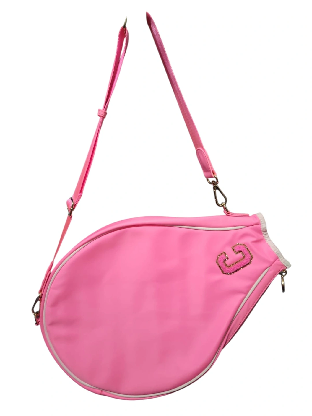 Here's a cute stoner clover tennis racquet bag in pink! It's in great condition and perfect for carrying your racquet in style. It features a shoulder strap for easy carrying.