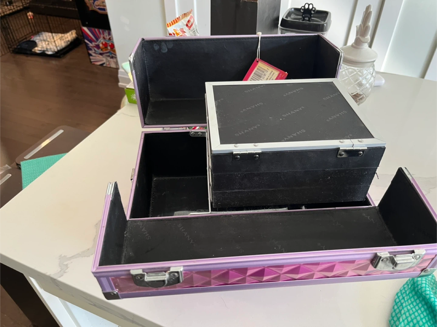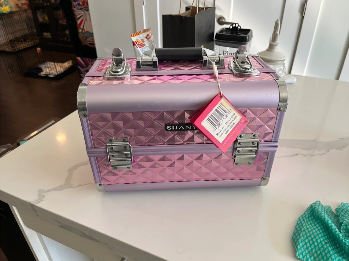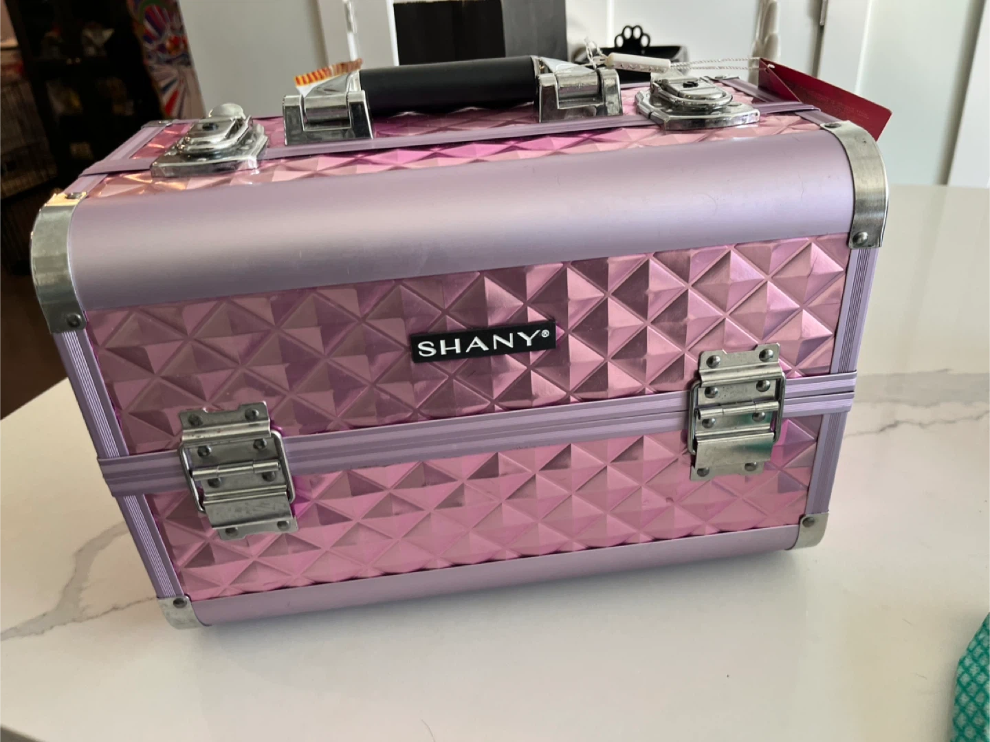 This SHANY makeup train case features a diamond-patterned pink exterior. It has a built-in mirror and multiple compartments for organization. Great for storing makeup and accessories!
