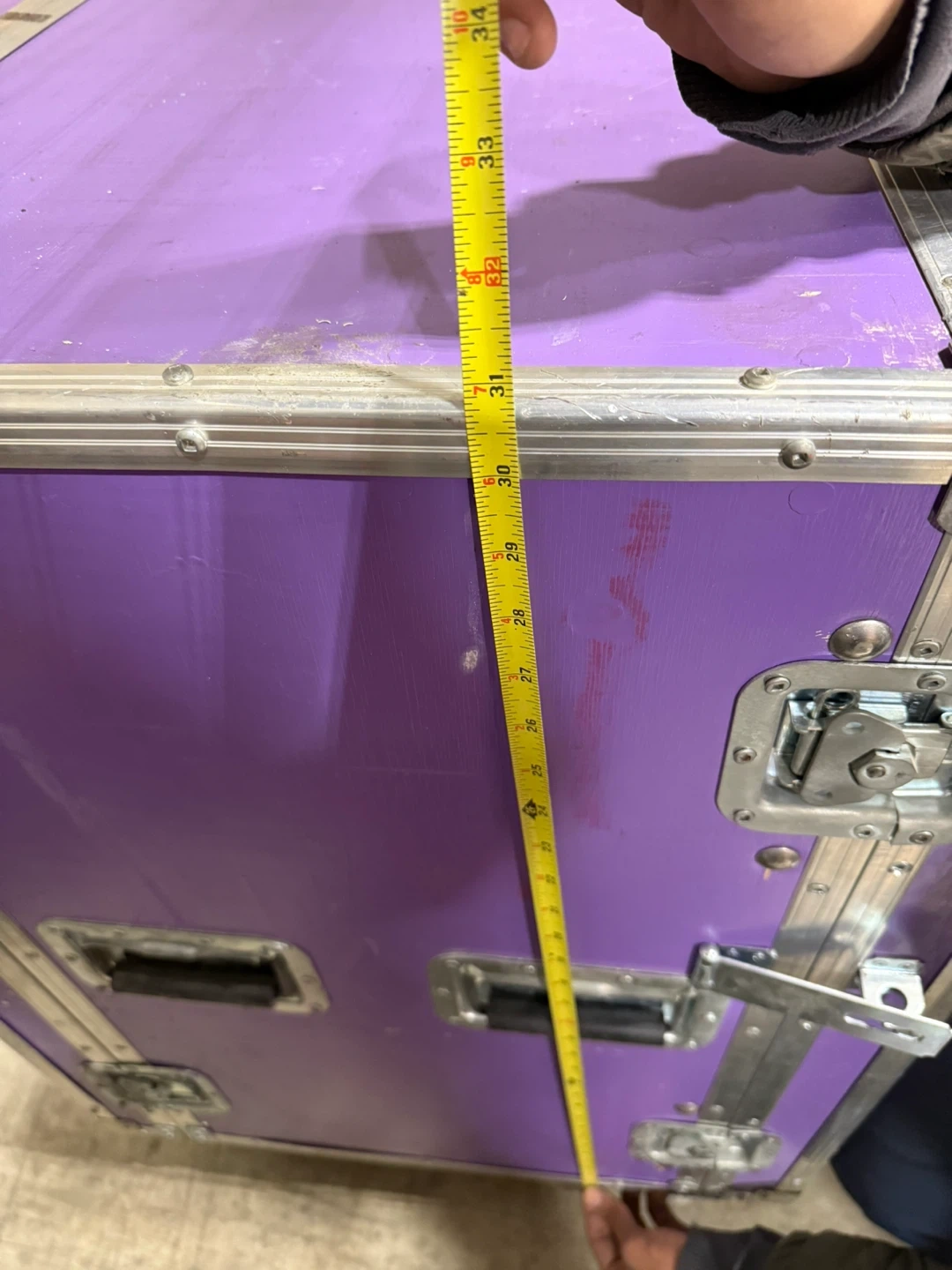 Heavy-duty road case, great for transporting equipment. It has sturdy metal latches and corner protectors. Approximate dimensions are 24" tall and 34" wide. This case is ideal for musicians or event professionals.