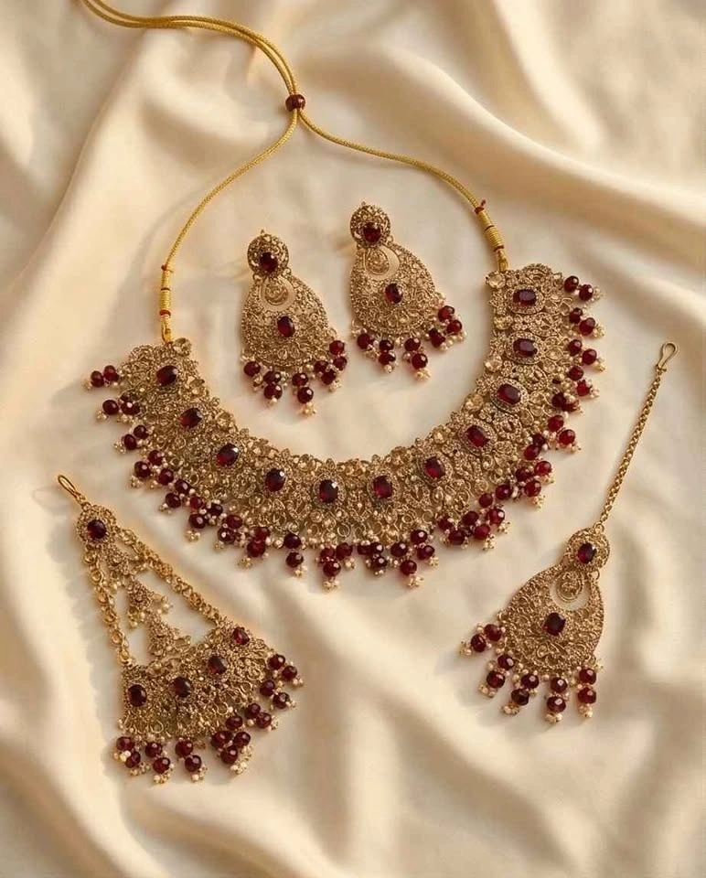 Beautiful premium jewelry set in red and gold tone. Perfect for weddings, Eid, parties, and special occasions. Set includes: Necklace, Earrings, Maang Tikka, Passa. Buy 1 Get 1 FREE (Limited pieces available).
