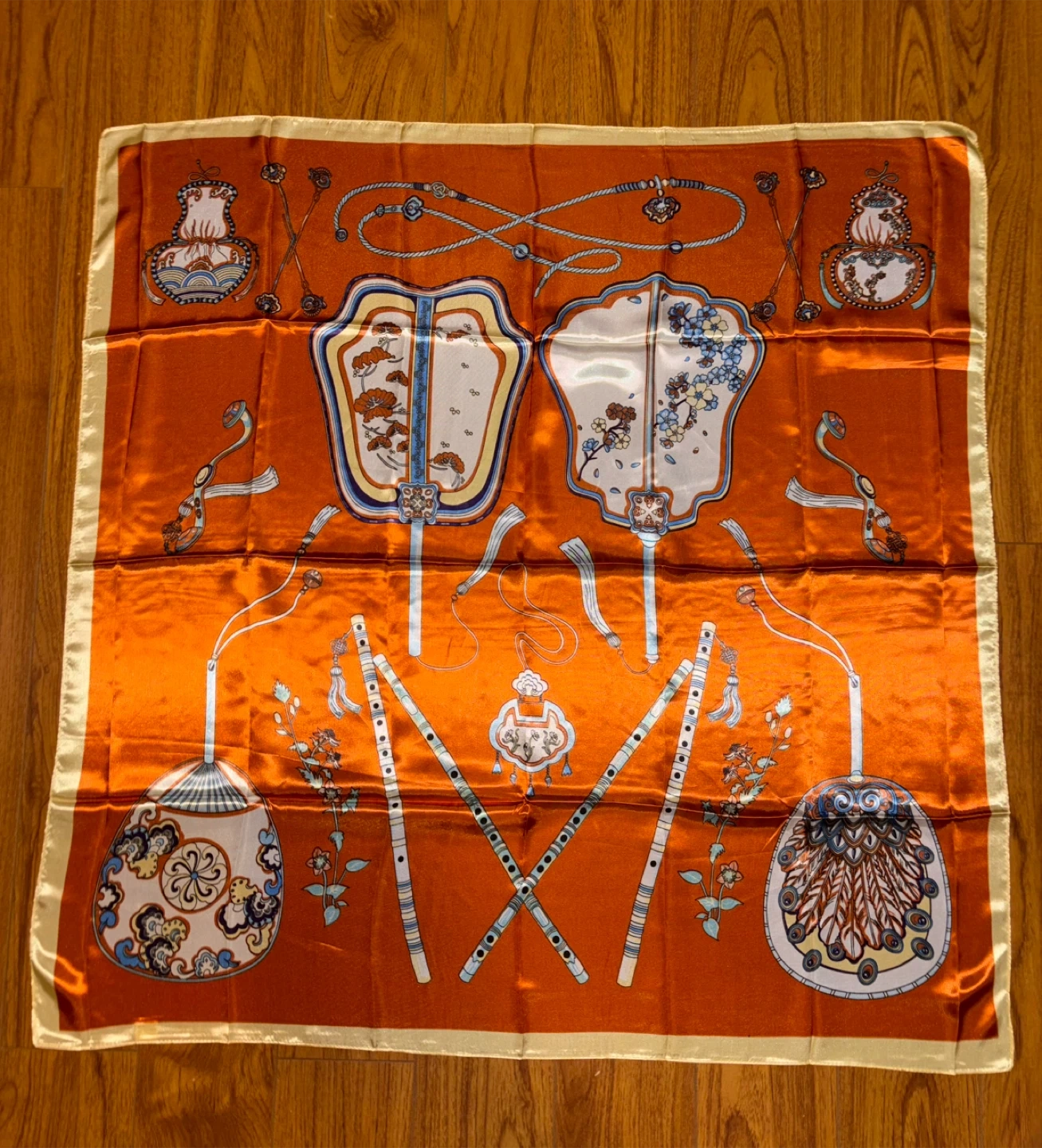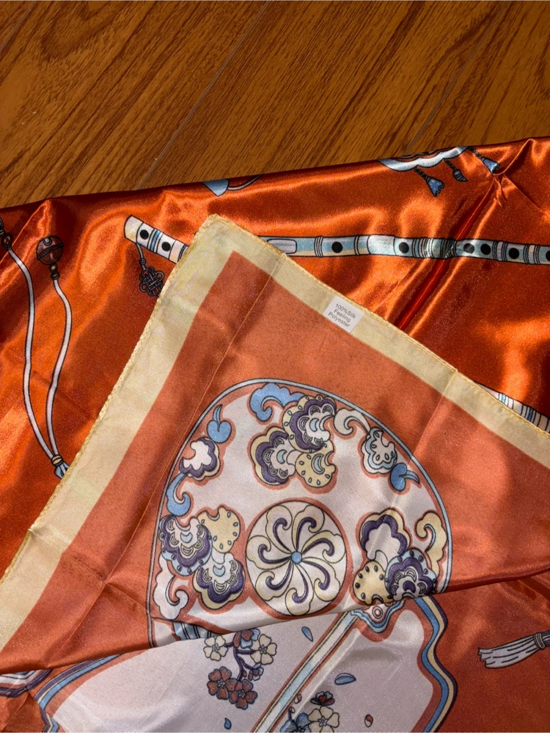 This beautiful silk scarf features a vibrant orange colour with an intricate traditional design of fans, flutes, and decorative motifs. It's made from a silk and polyester blend. The scarf's generous size makes it a versatile accessory.