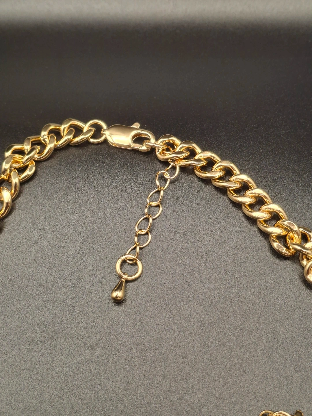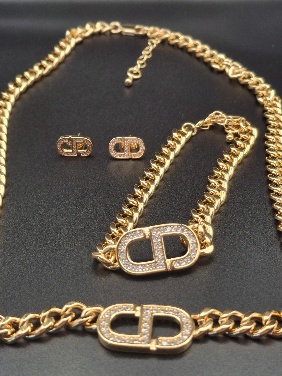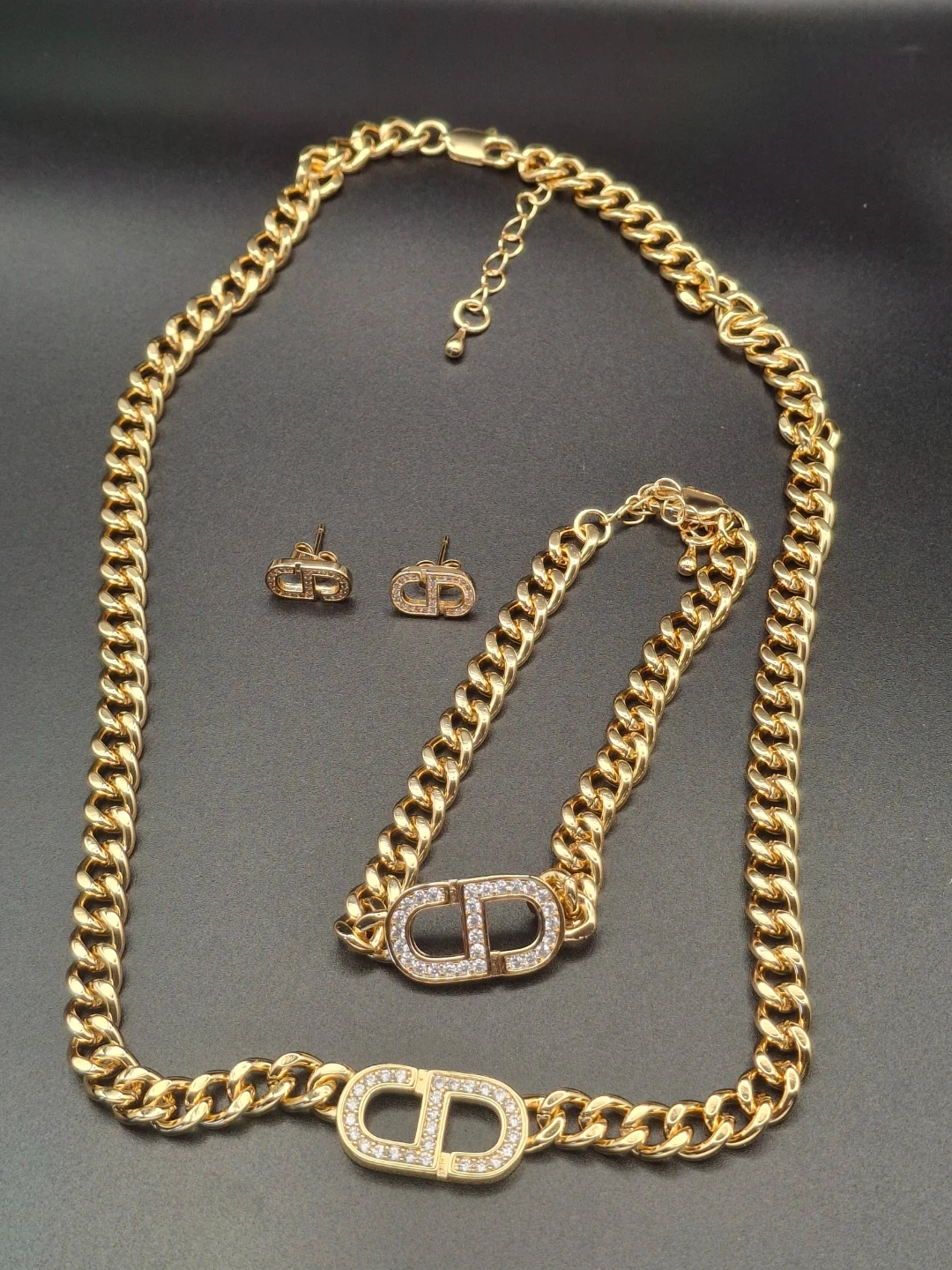This jewelry set includes a necklace, bracelet, and a pair of earrings. All pieces feature a chunky gold-tone chain with a prominent CD logo adorned with sparkling rhinestones. The necklace and bracelet have adjustable extension chains.