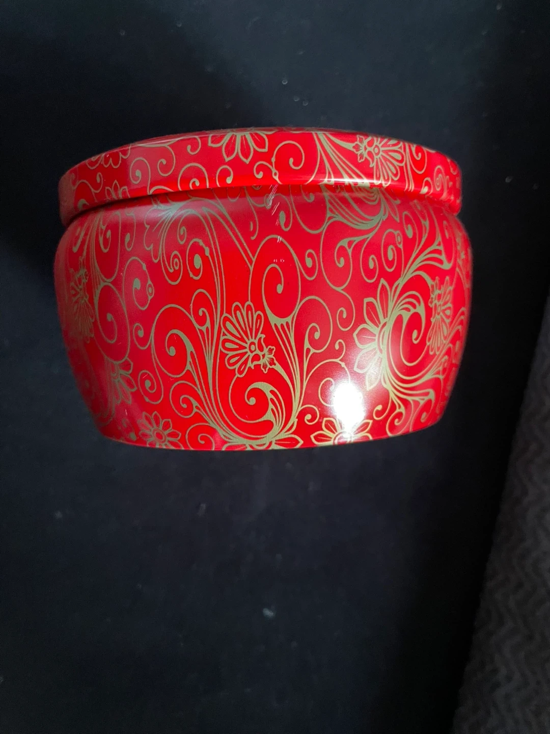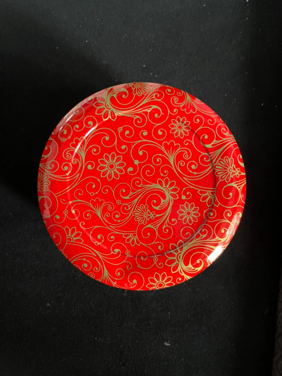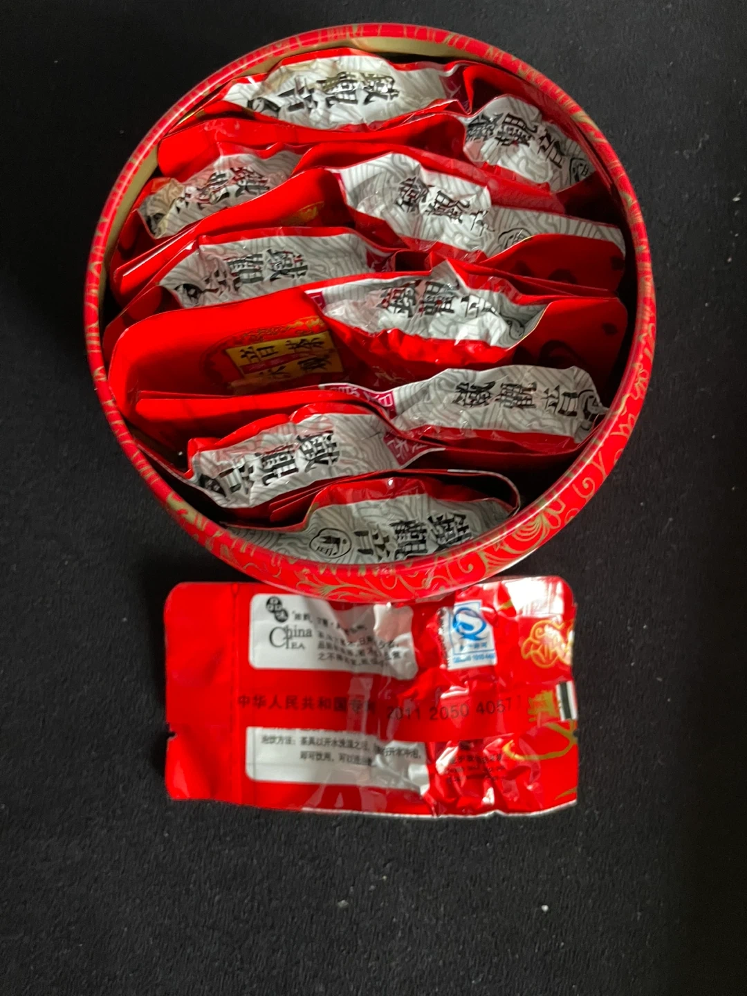 This is a red tin featuring a gold floral pattern. It's filled with individually wrapped China tea bags. Perfect for tea lovers!