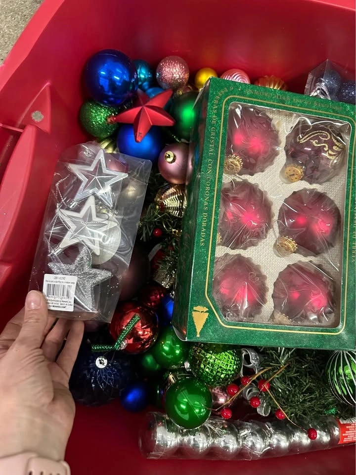 Large storage bin full of Christmas ornaments and decorations. Includes a wide variety of styles, colors, and sizes — glass balls, decorative ornaments, garlands, and more. Some items are new in packaging, others gently used. Overall in good condition and perfect for decorating your tree or home for the holidays. Comes with the storage bin. Sold as a full set only. Please see photos for details. Pickup in Buffalo Grove.