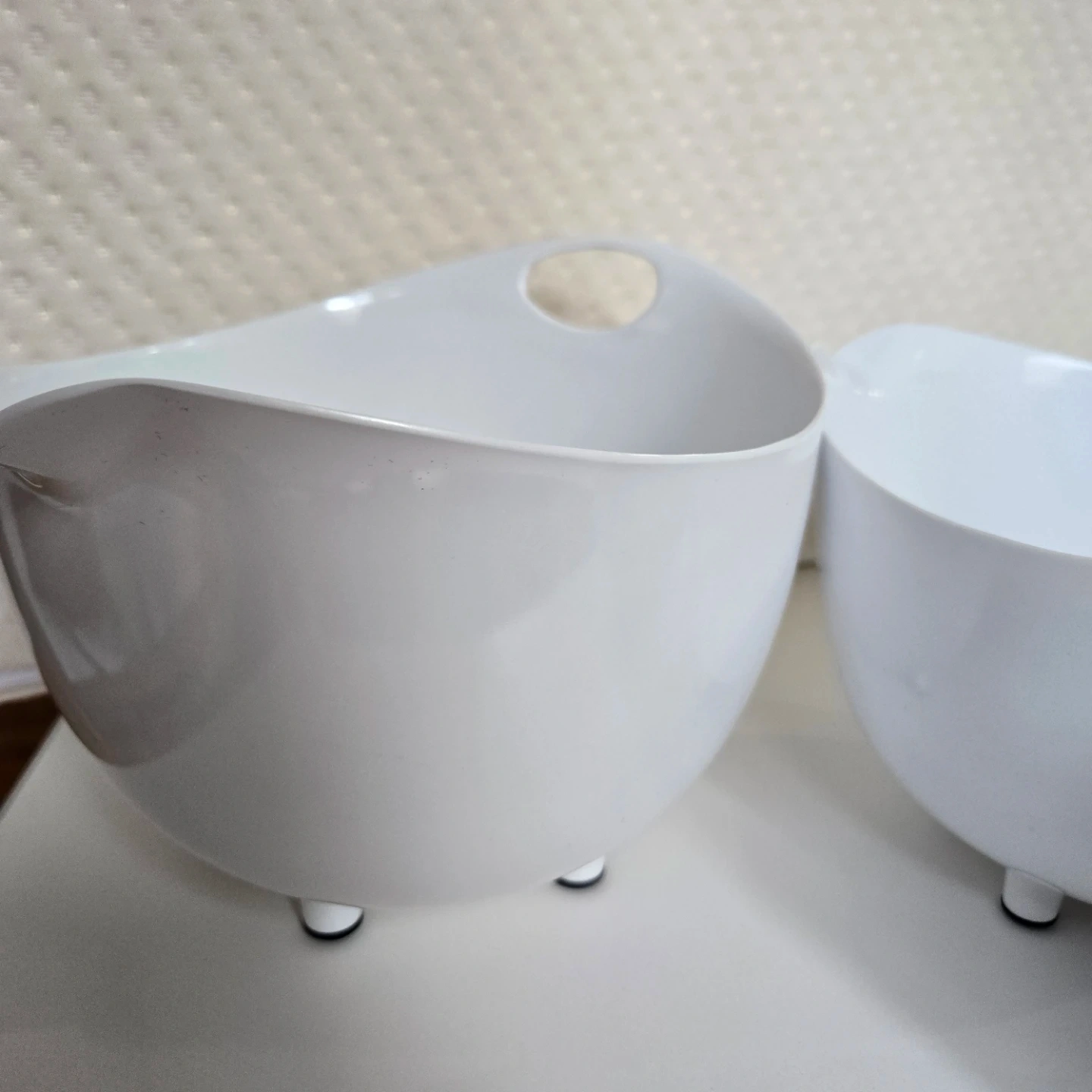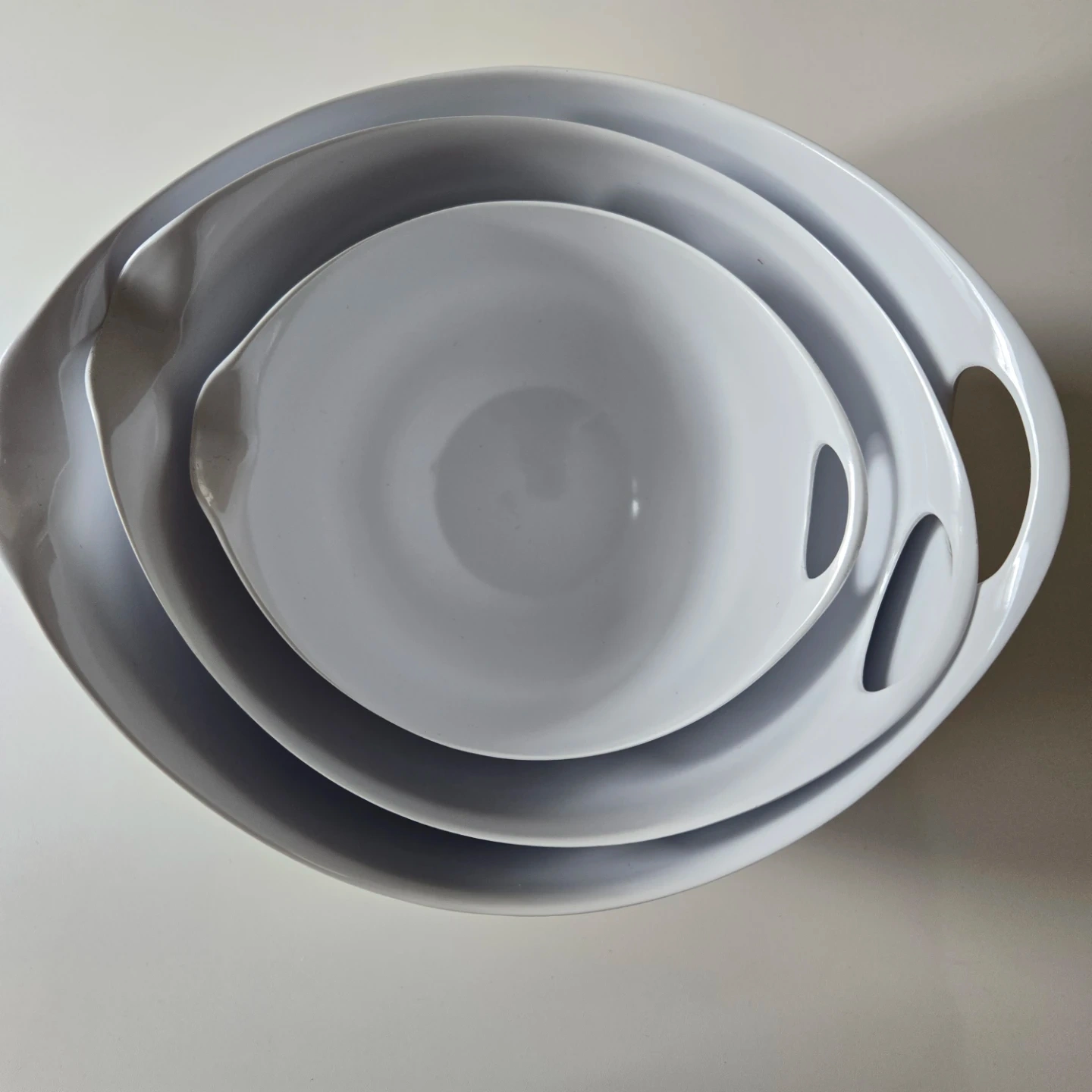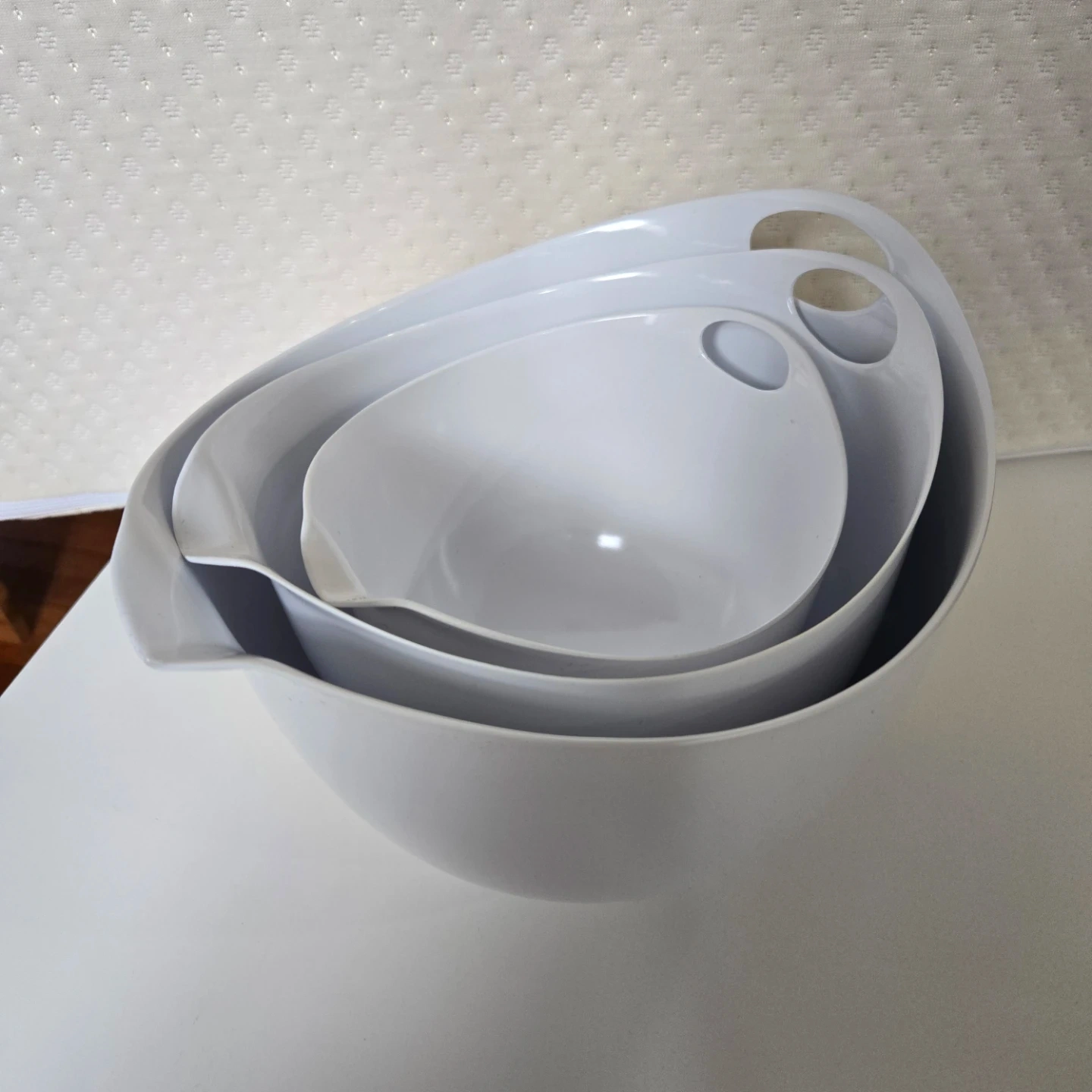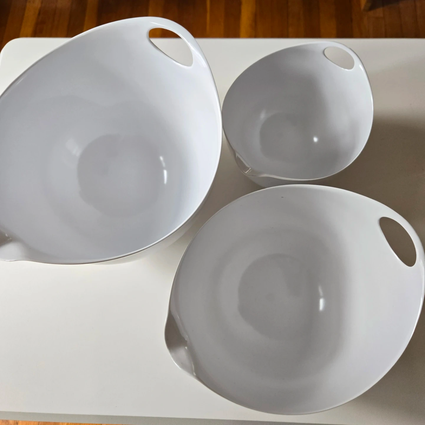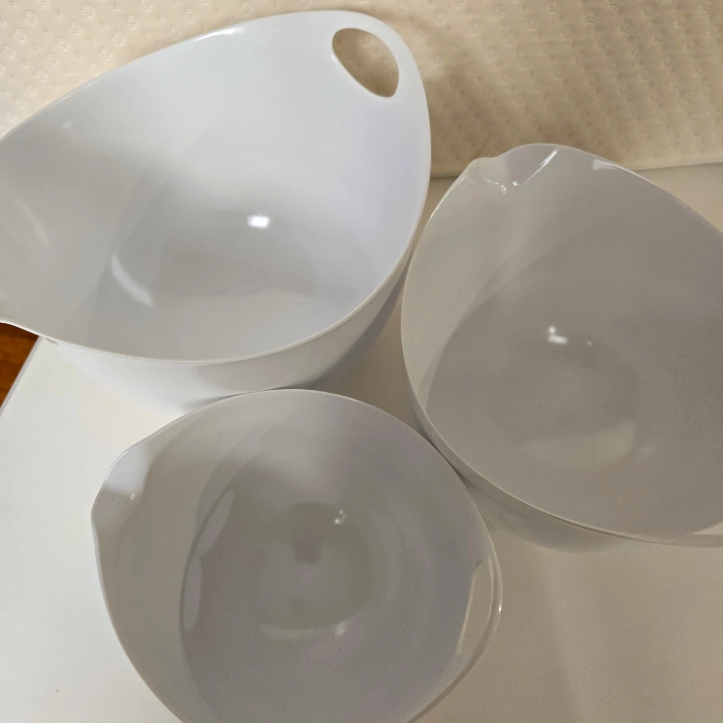 Selling a set of three white mixing bowls! They nest inside each other for easy storage. Perfect for baking or cooking, these bowls are in great condition and ready for a new kitchen.