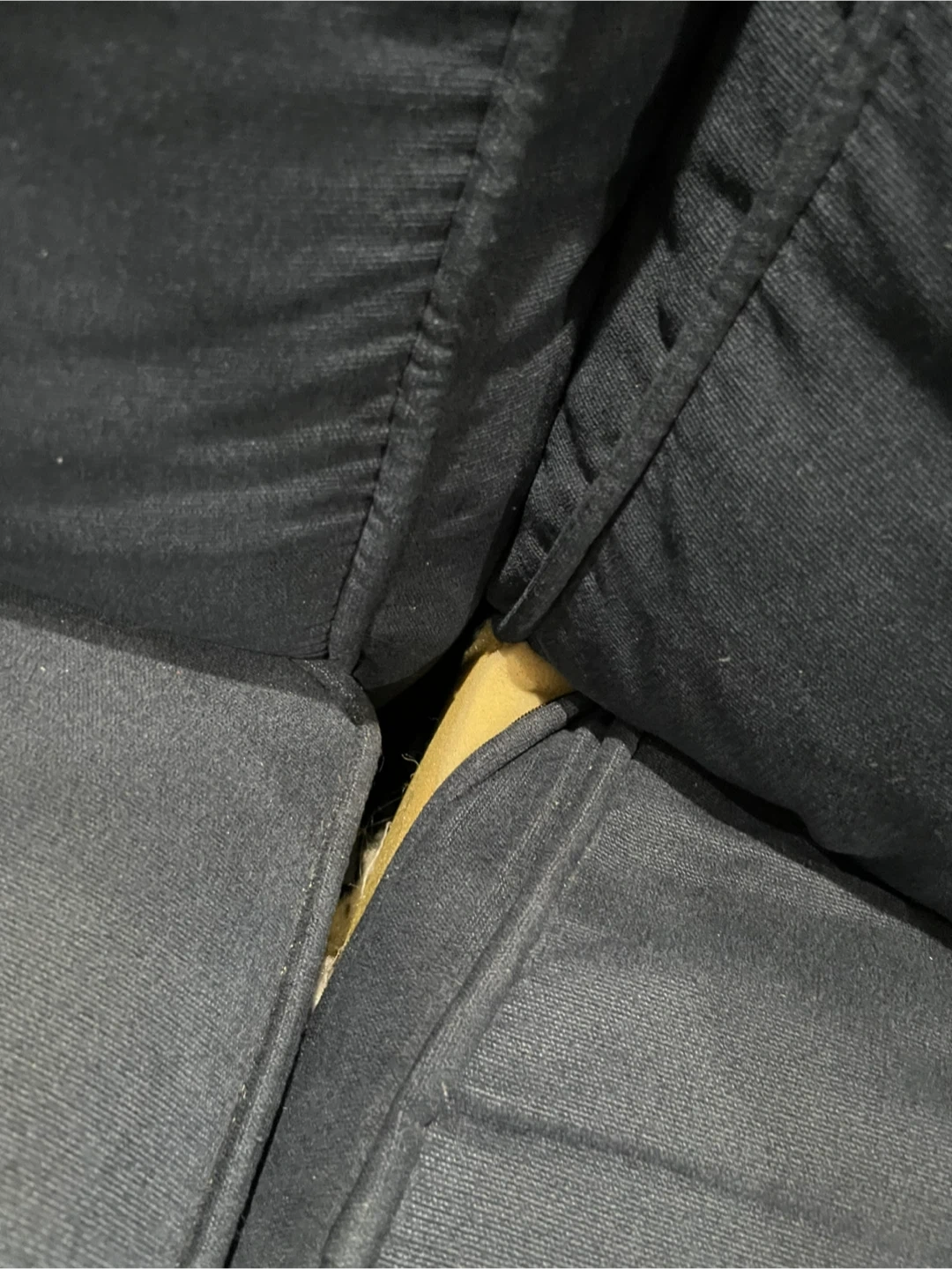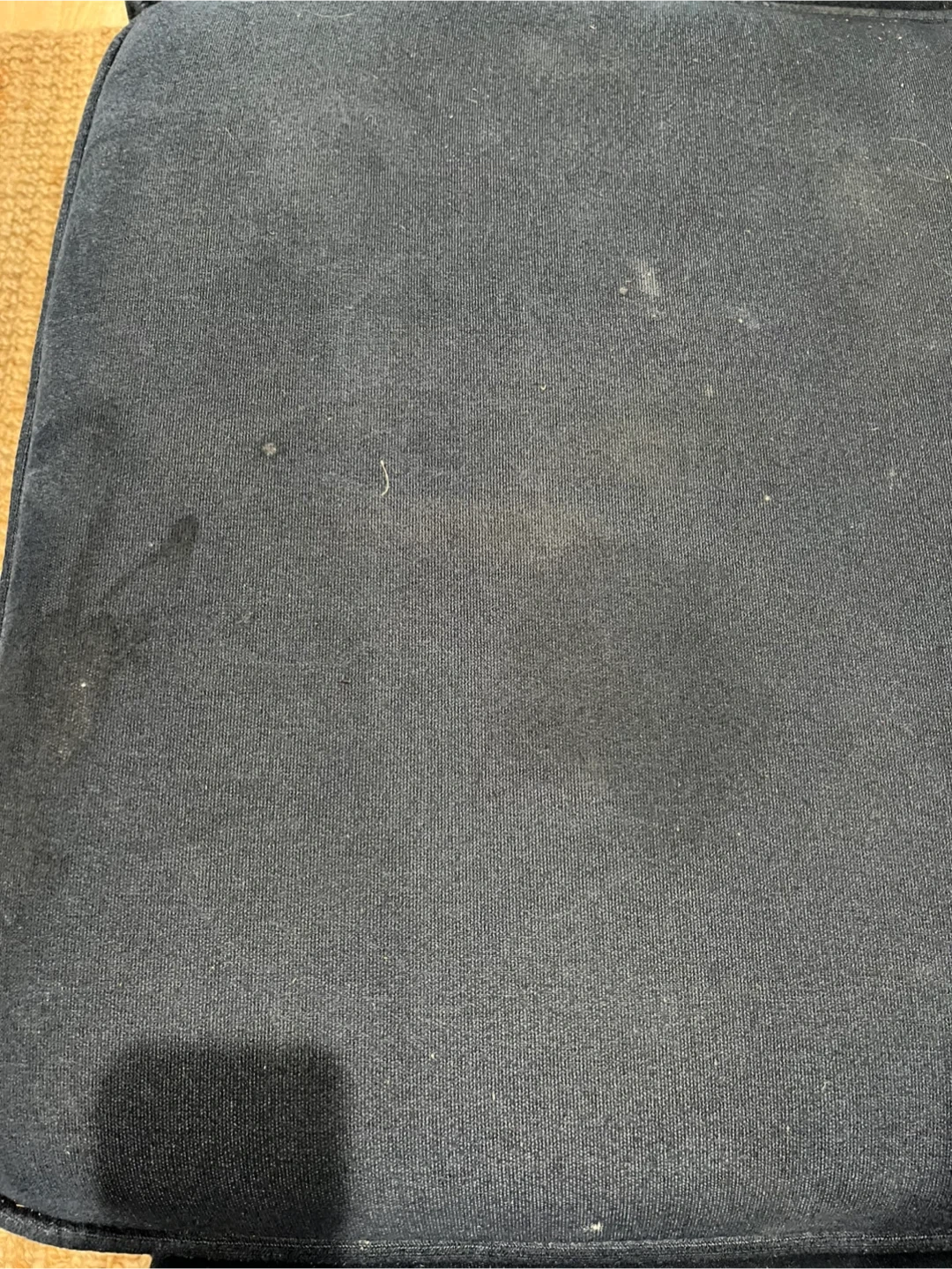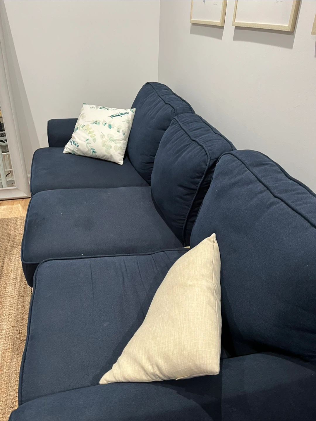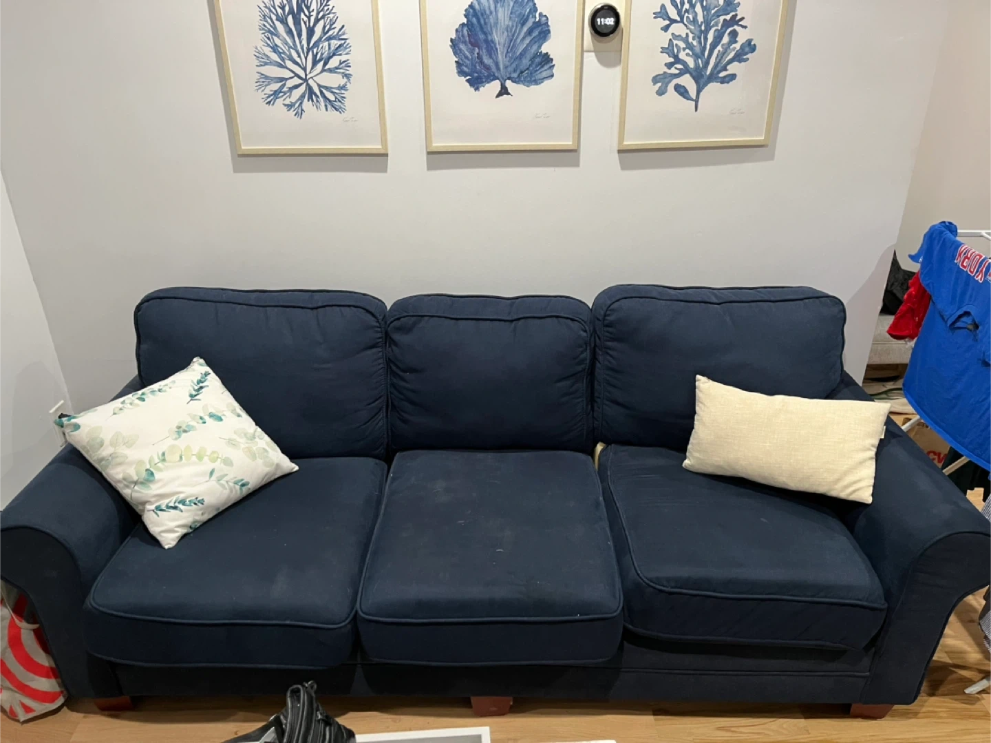 Used couch with a few stains on the middle cushion and a rip on the right cushion cover (easy to cover with a pillow or by tucking into the couch). Wear is pictured. Other than that, a quality, comfortable couch. MUST be able to move and transport on your own!!