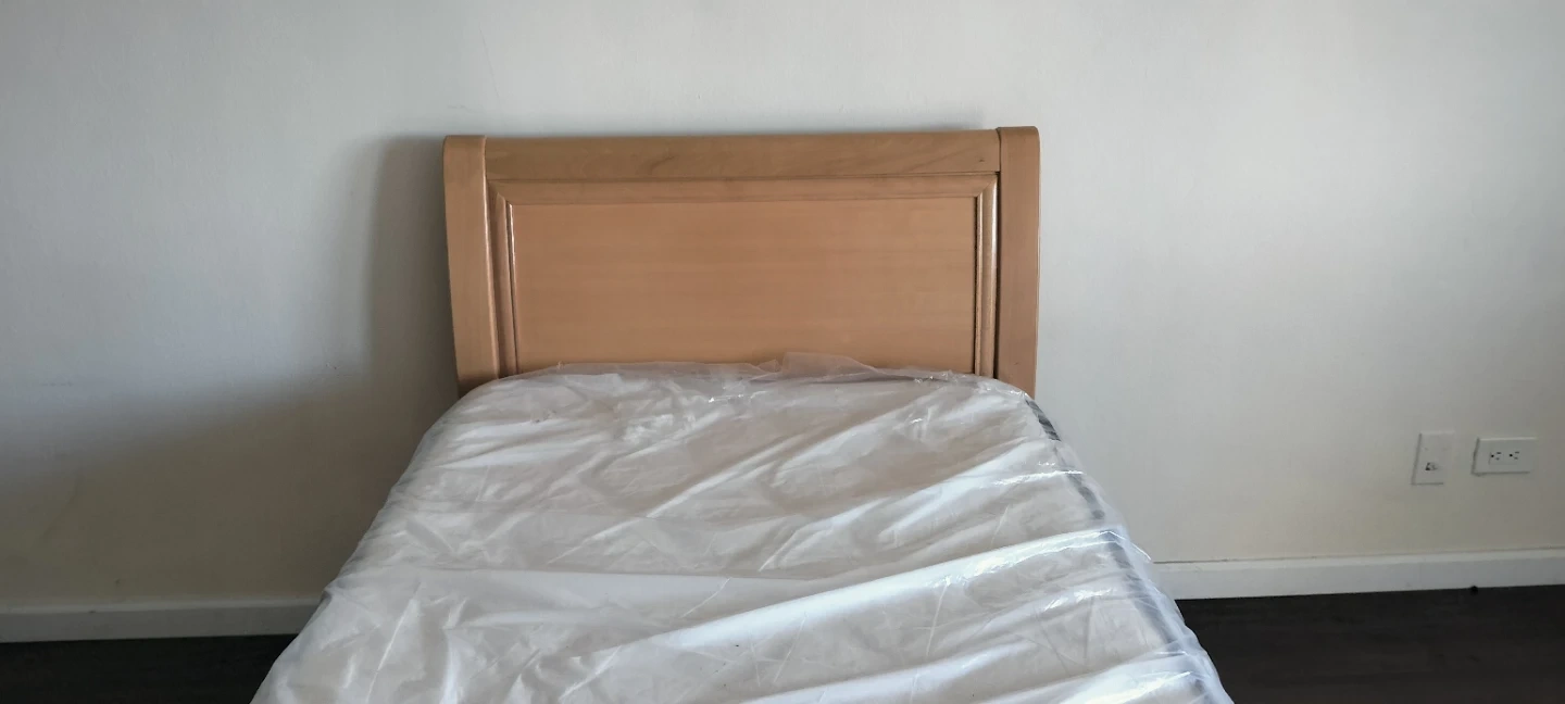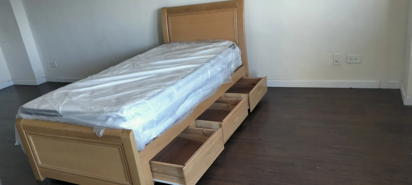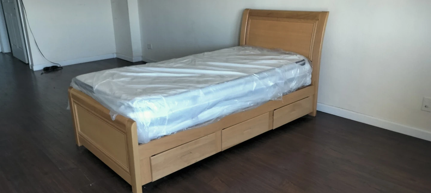 90% New. Solid wood twin bed frame with three storage drawers. Includes a twin mattress still in its plastic protective wrap. The mattress has a quilted top.