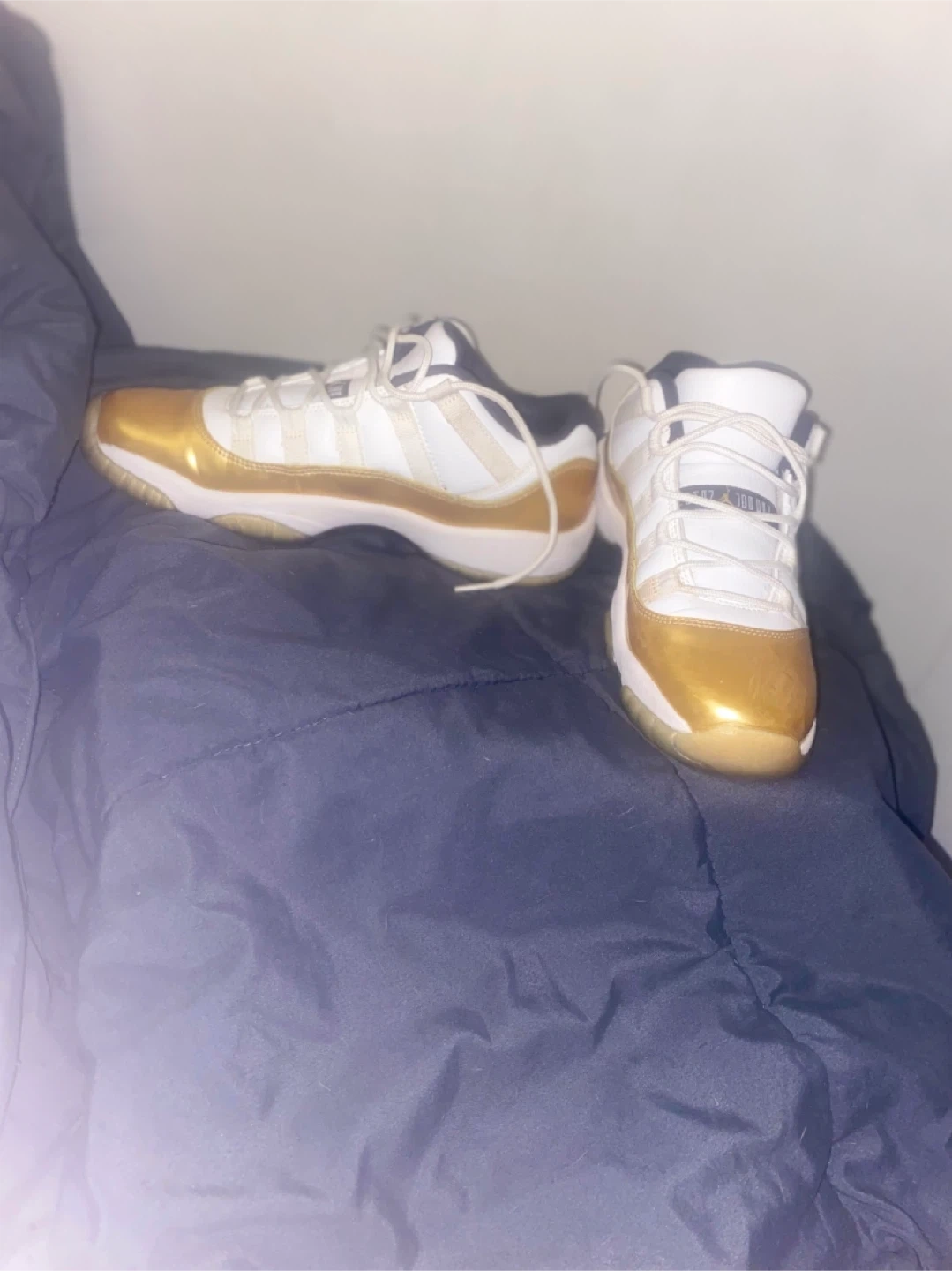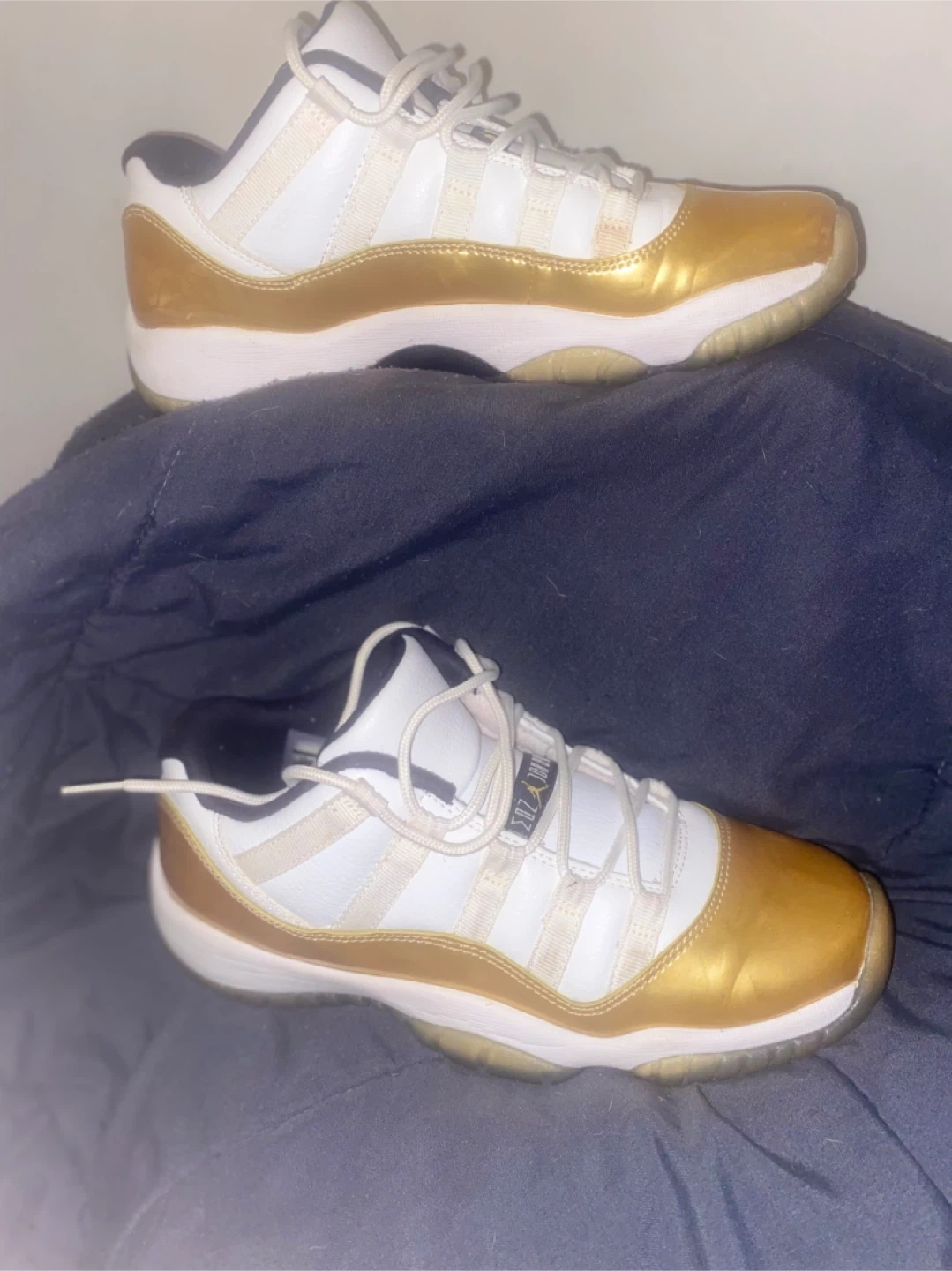 These Air Jordan 11 Retro Low sneakers feature a white and metallic gold colorway. The design includes a leather upper with patent leather overlays. It's a low-top silhouette with a rubber sole.