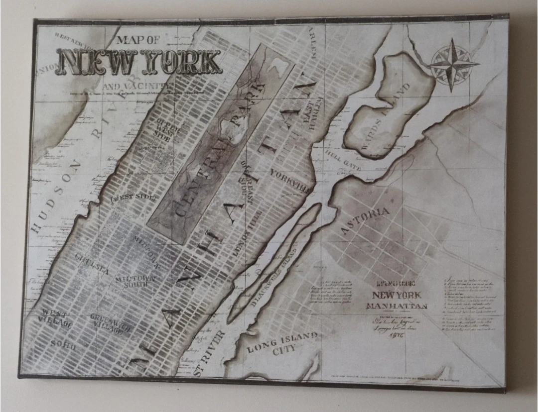 This is a decorative map of New York City and surrounding areas, featuring a vintage aesthetic. It includes major landmarks and street layouts. This map is dated 1876. 35 1/2" X 27"