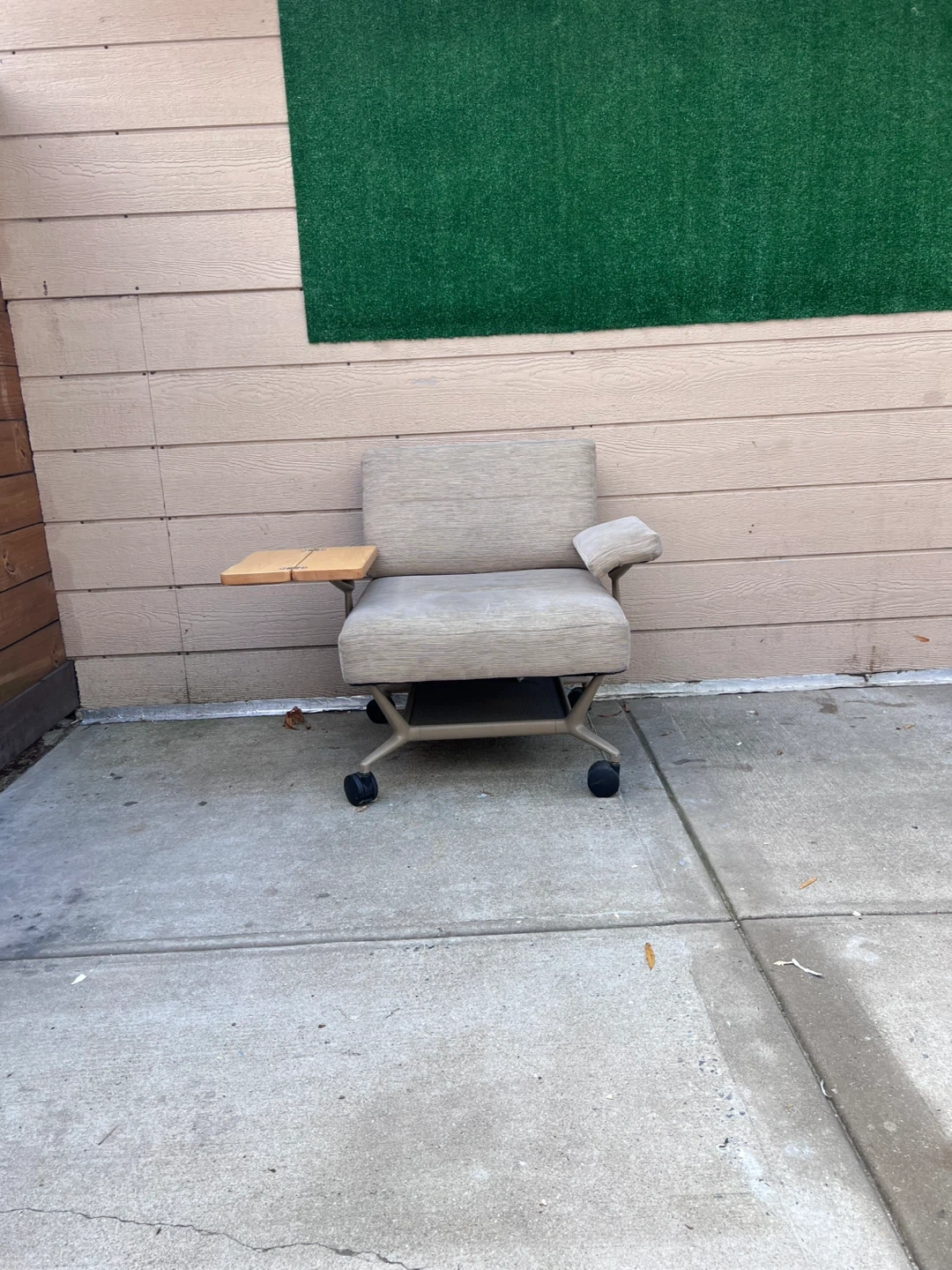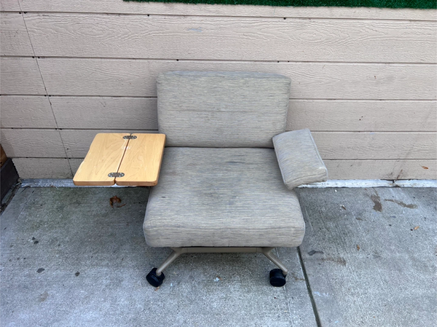 This is a comfortable rolling armchair, perfect for a study or office space. It features a convenient side table that can be folded away when not in use. The chair is a neutral beige color and in good condition. It's ready to add some functionality to your space!