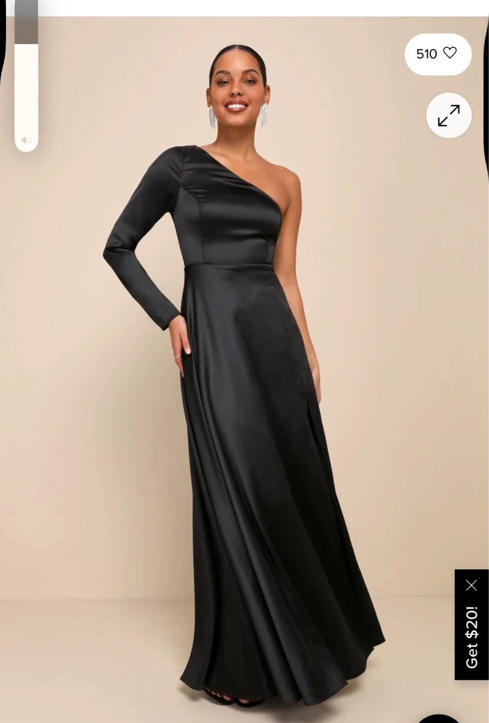 This stunning black satin maxi dress features a chic one-shoulder design with a long sleeve on one side. Its sleek silhouette and flowing skirt make it a sophisticated choice for any formal event. Made from smooth satin fabric for a luxurious feel.