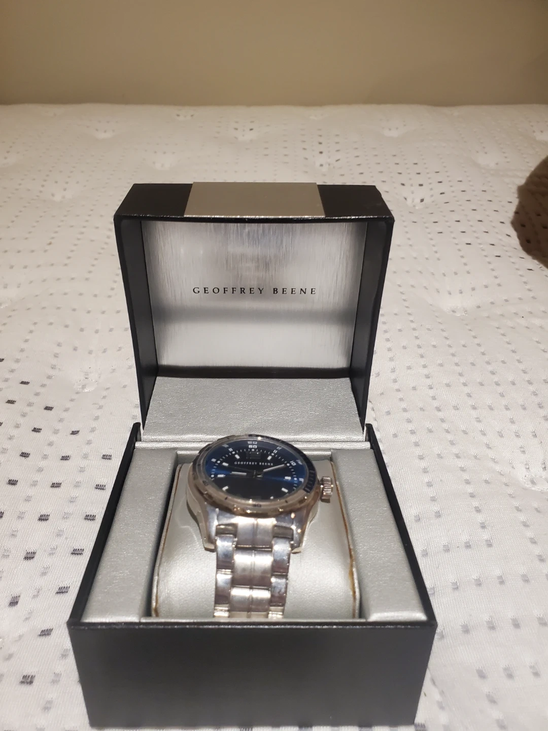Geoffrey Beene men's watch in silver tone with a blue dial. Comes in its original presentation box. Watch band material is metal.