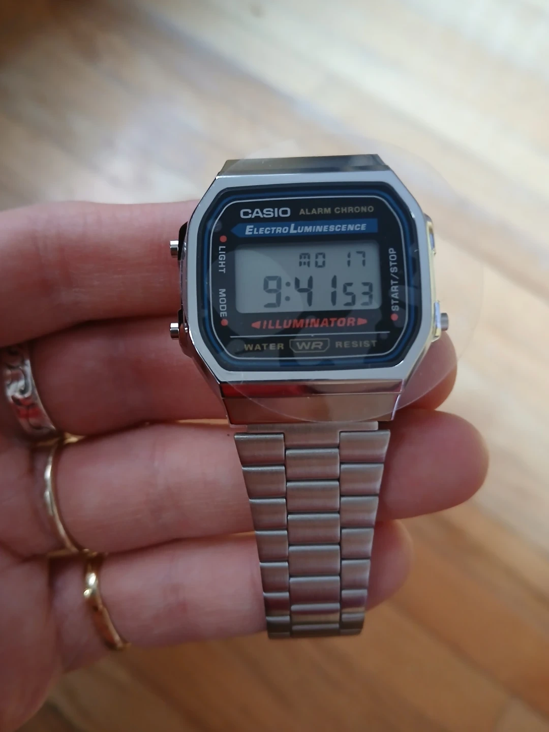 This is a Casio A168WA-1WCR digital watch with a stainless steel band. It features Electro Luminescence for illumination and is water-resistant. Includes original box.