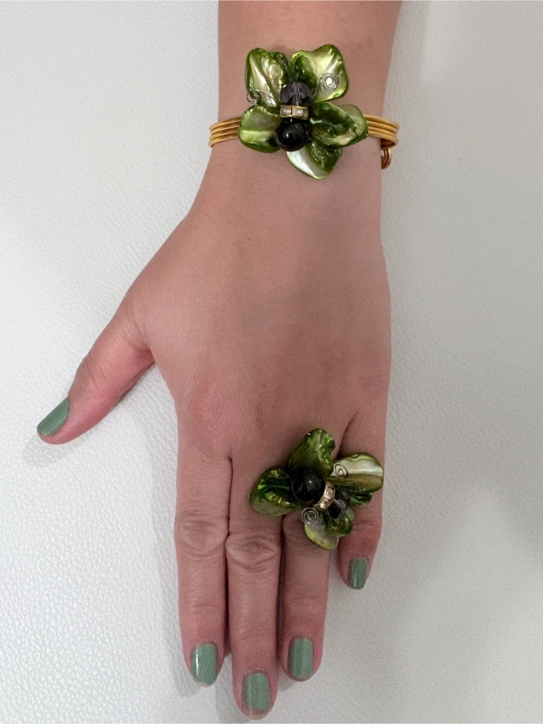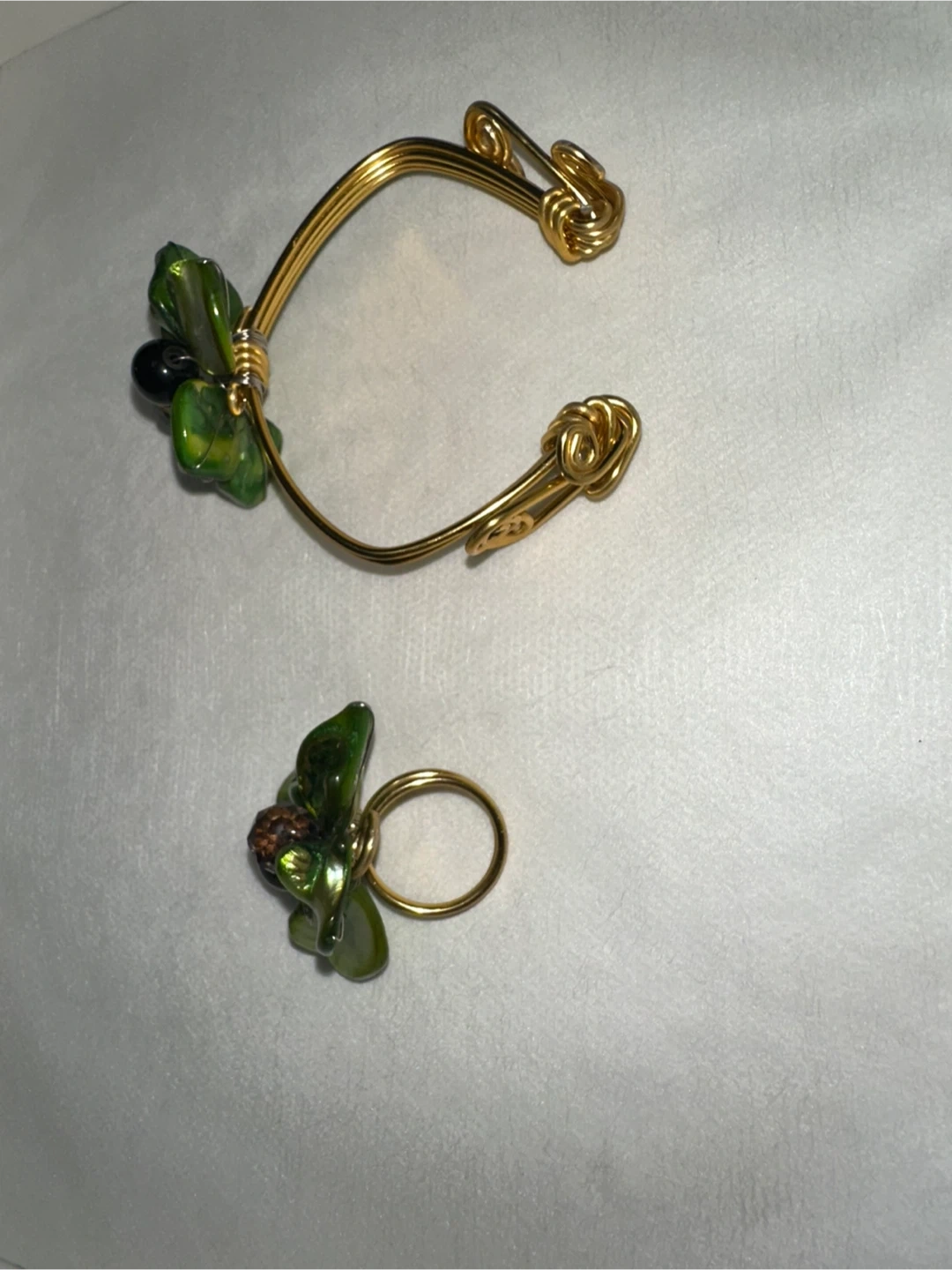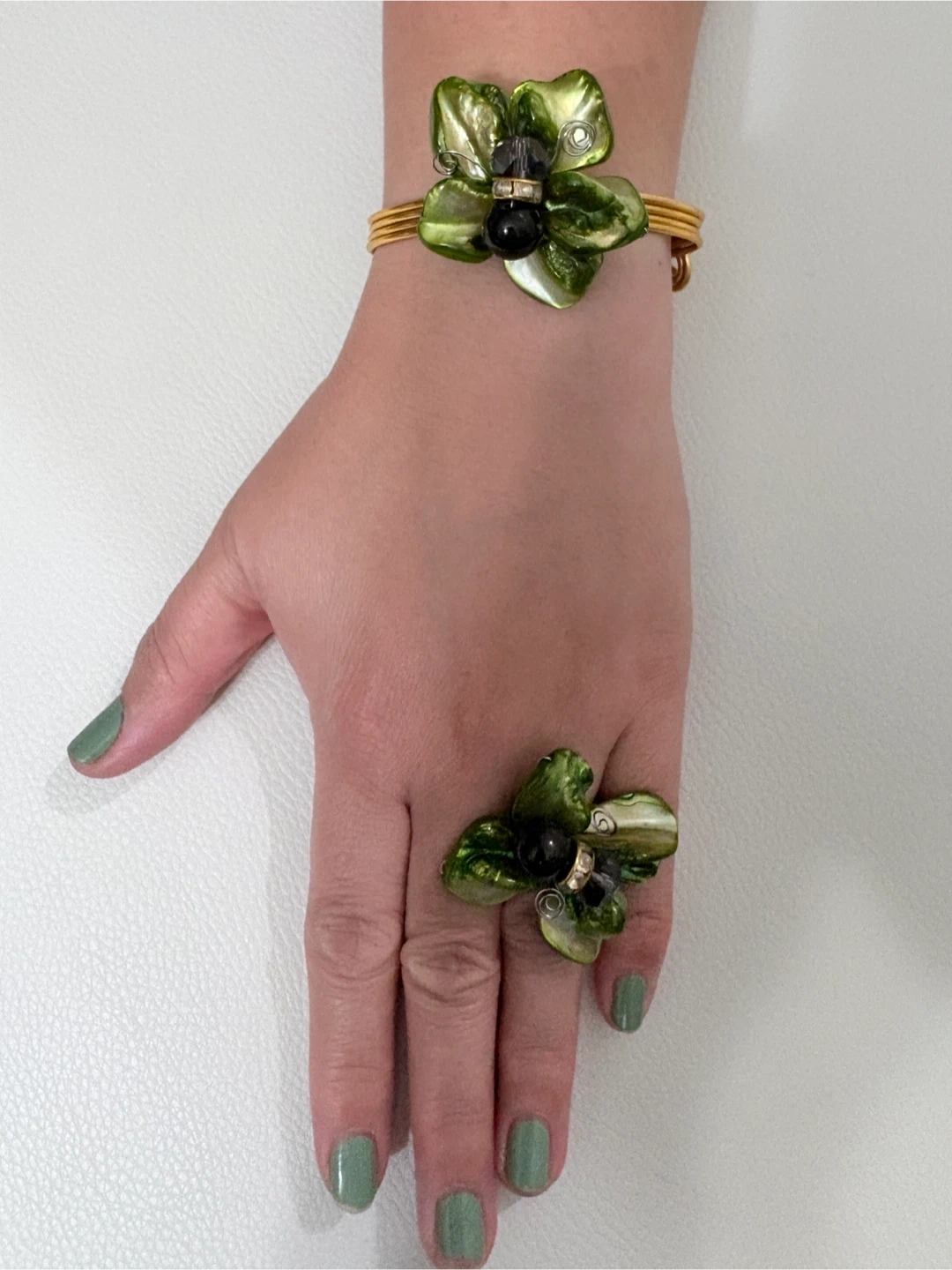 Here's a lovely matching bracelet and ring set! The gold-tone metal is adorned with green floral accents and small black beads. Perfect for adding a touch of nature-inspired elegance to your look