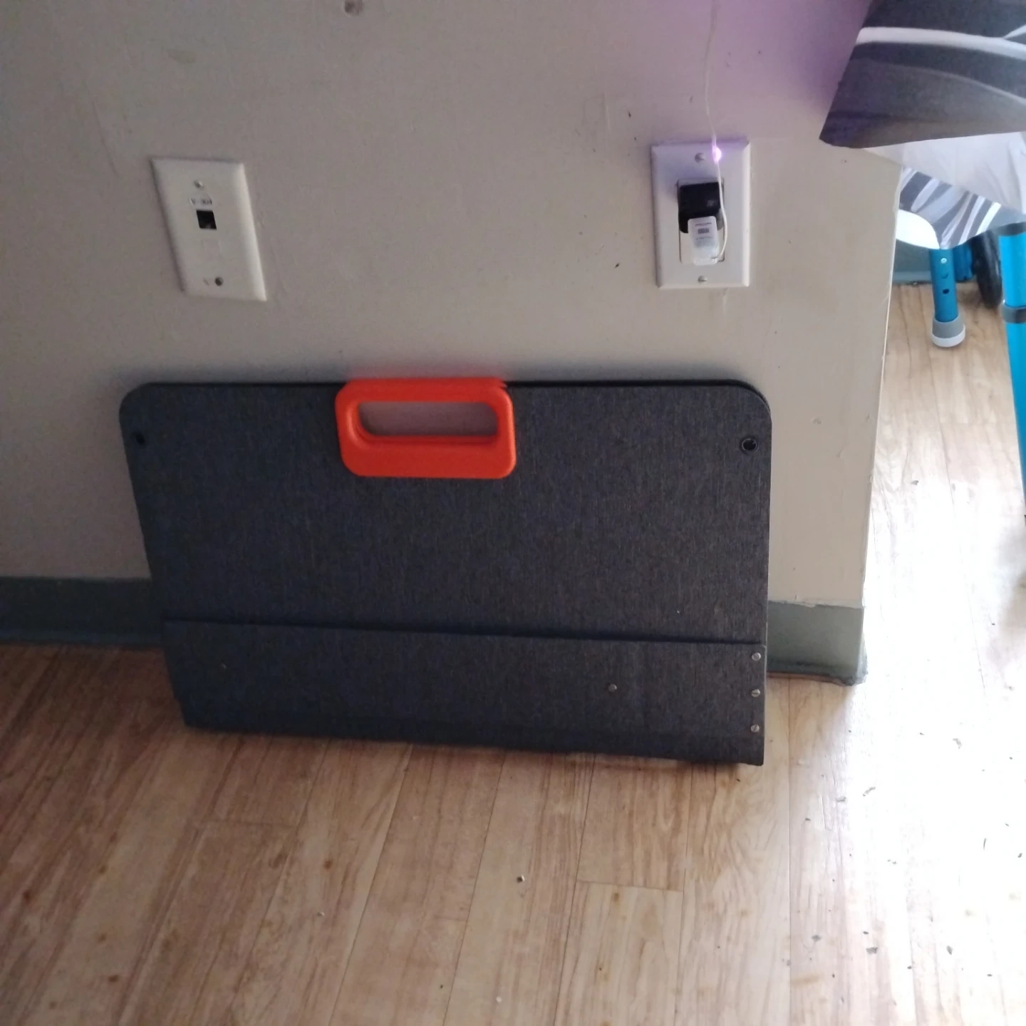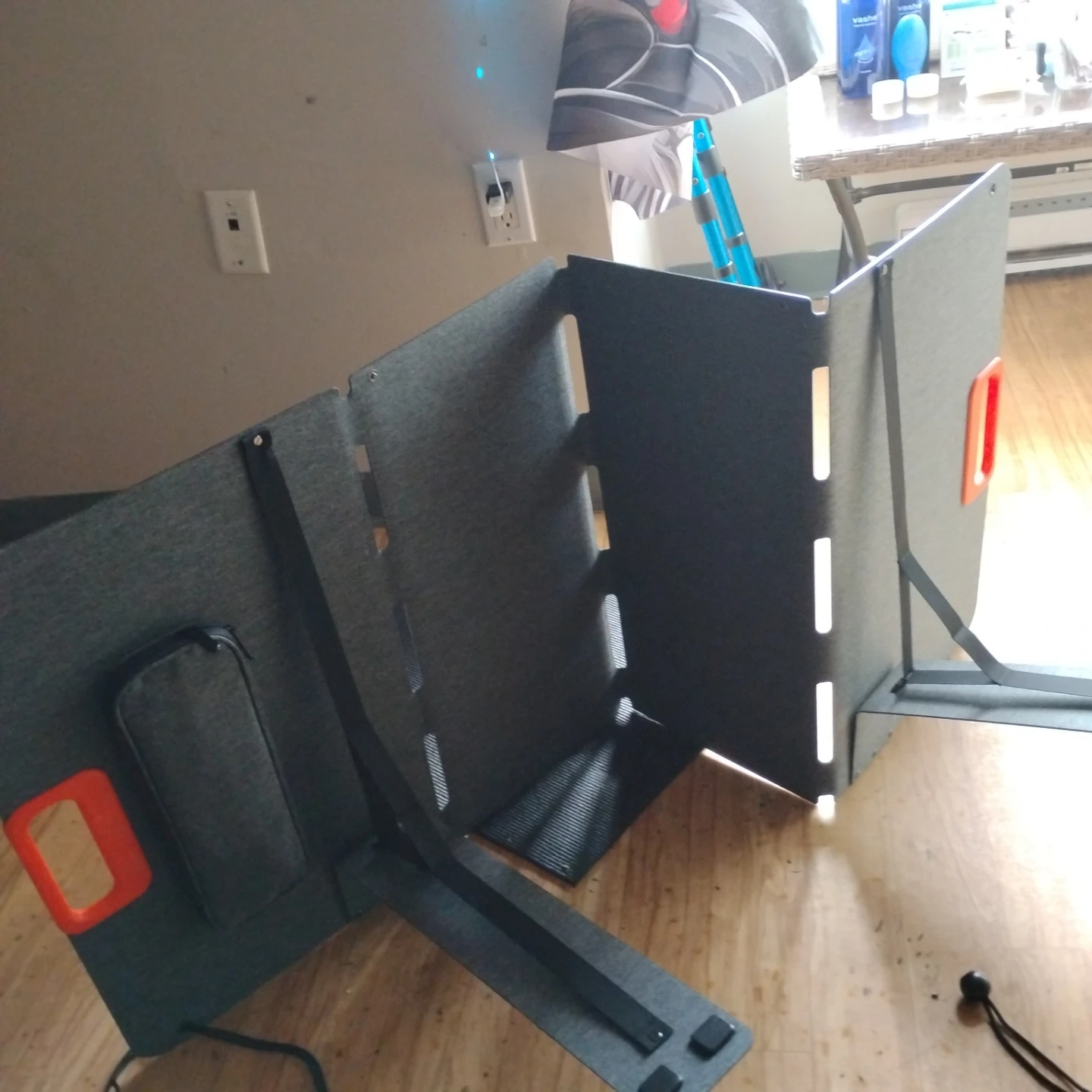This is a foldable solar panel for charging devices. It's designed to be portable and easy to set up. Comes with integrated kickstands for optimal sun exposure. Great for camping or emergency power needs!