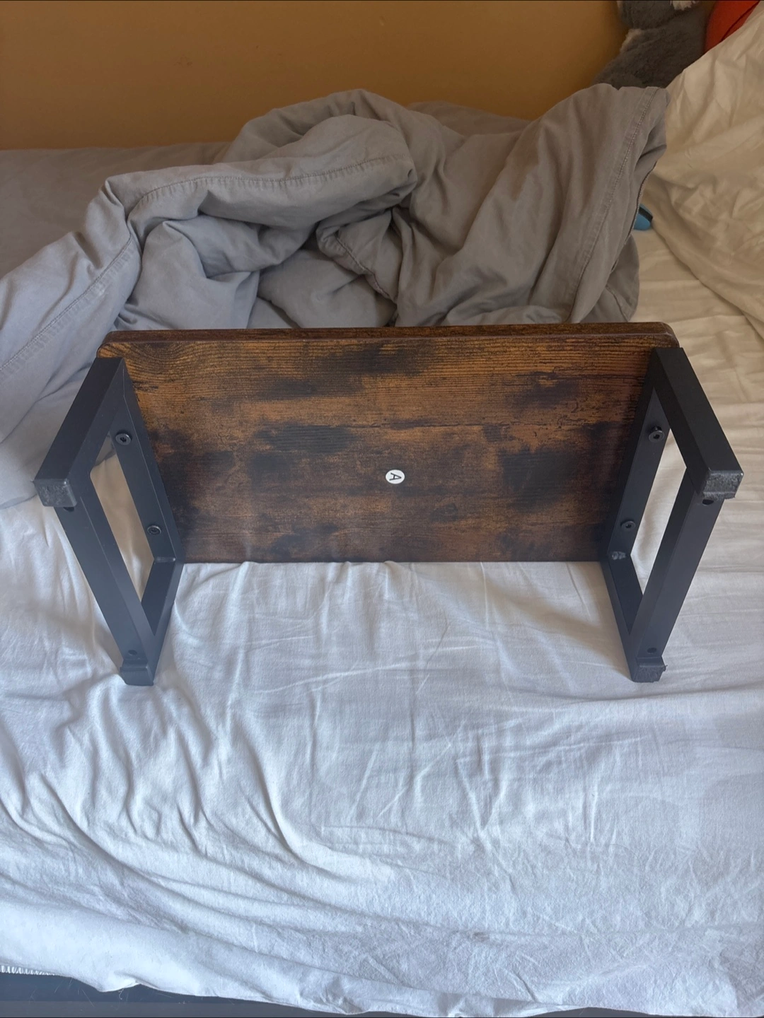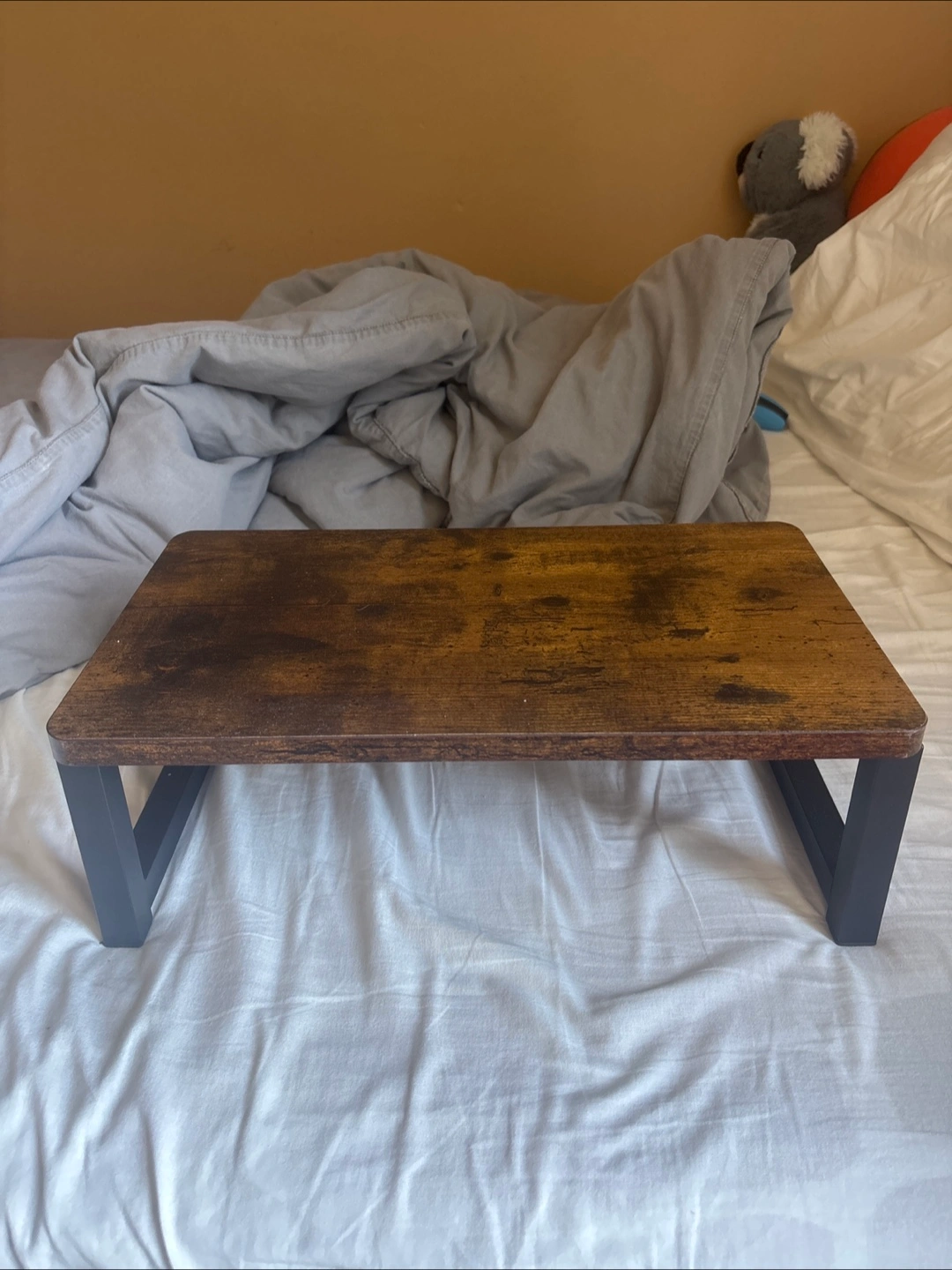 Here's a handy rustic brown bed desk with black metal legs! It's perfect for working or enjoying breakfast in bed. The desk has a nice, sturdy construction and a stylish, simple design that fits well in any room