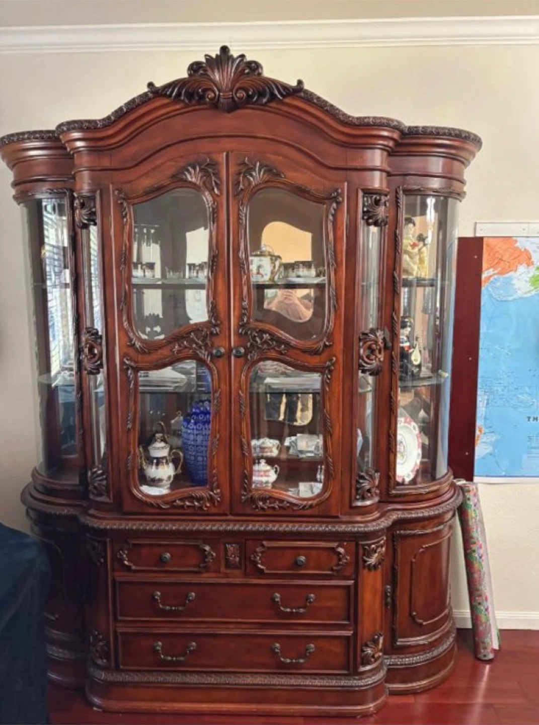 This is a beautiful antique wood china cabinet. It features ornate carvings and glass doors for display. The cabinet has multiple shelves and drawers for storage. It's a statement piece for any dining room!