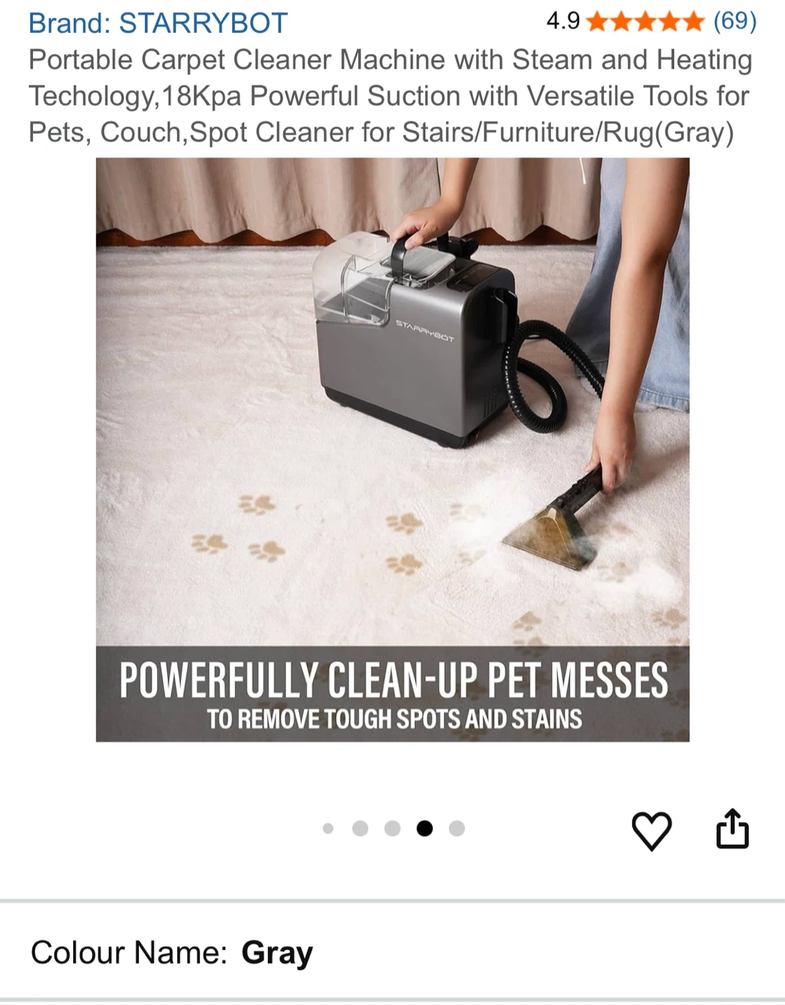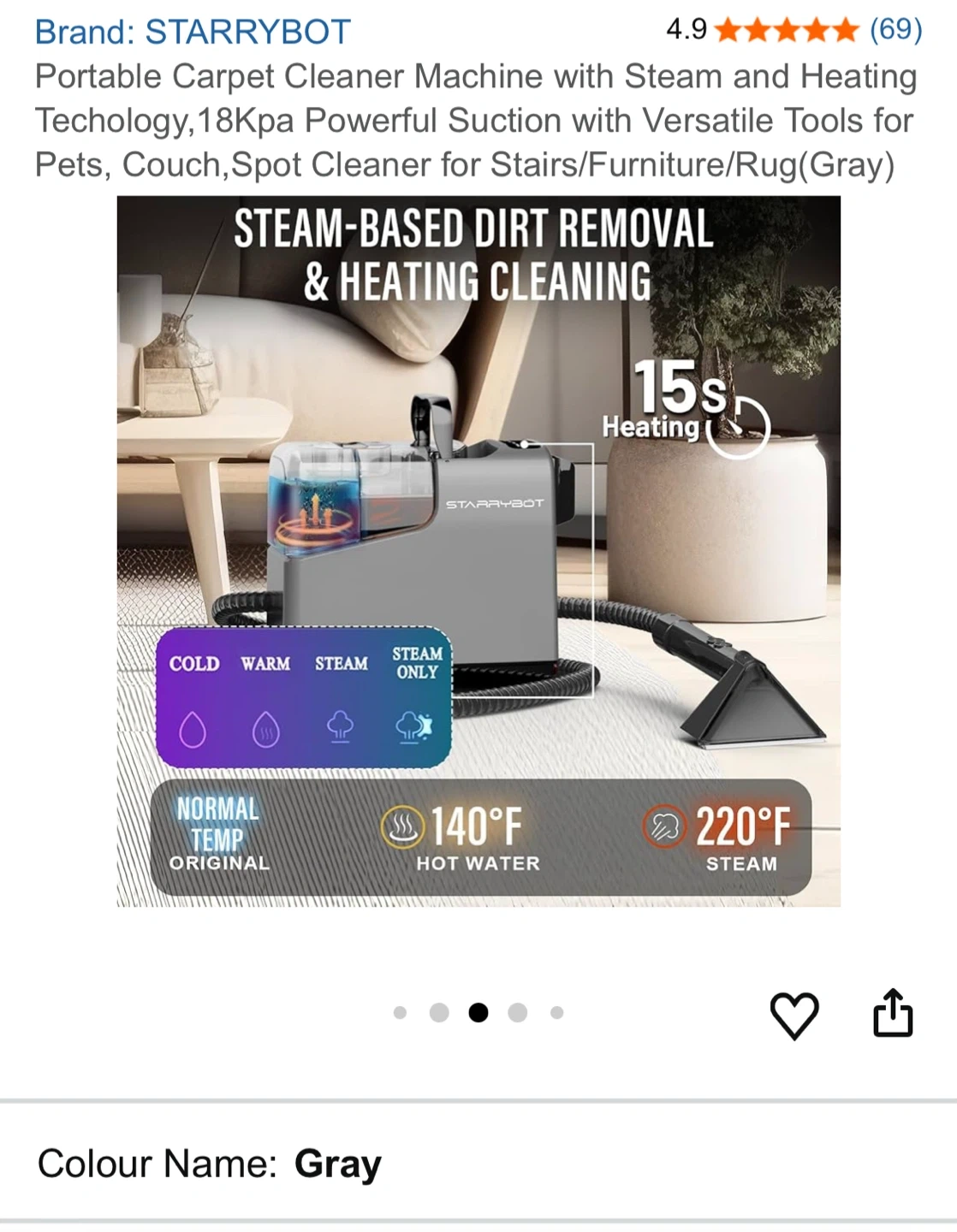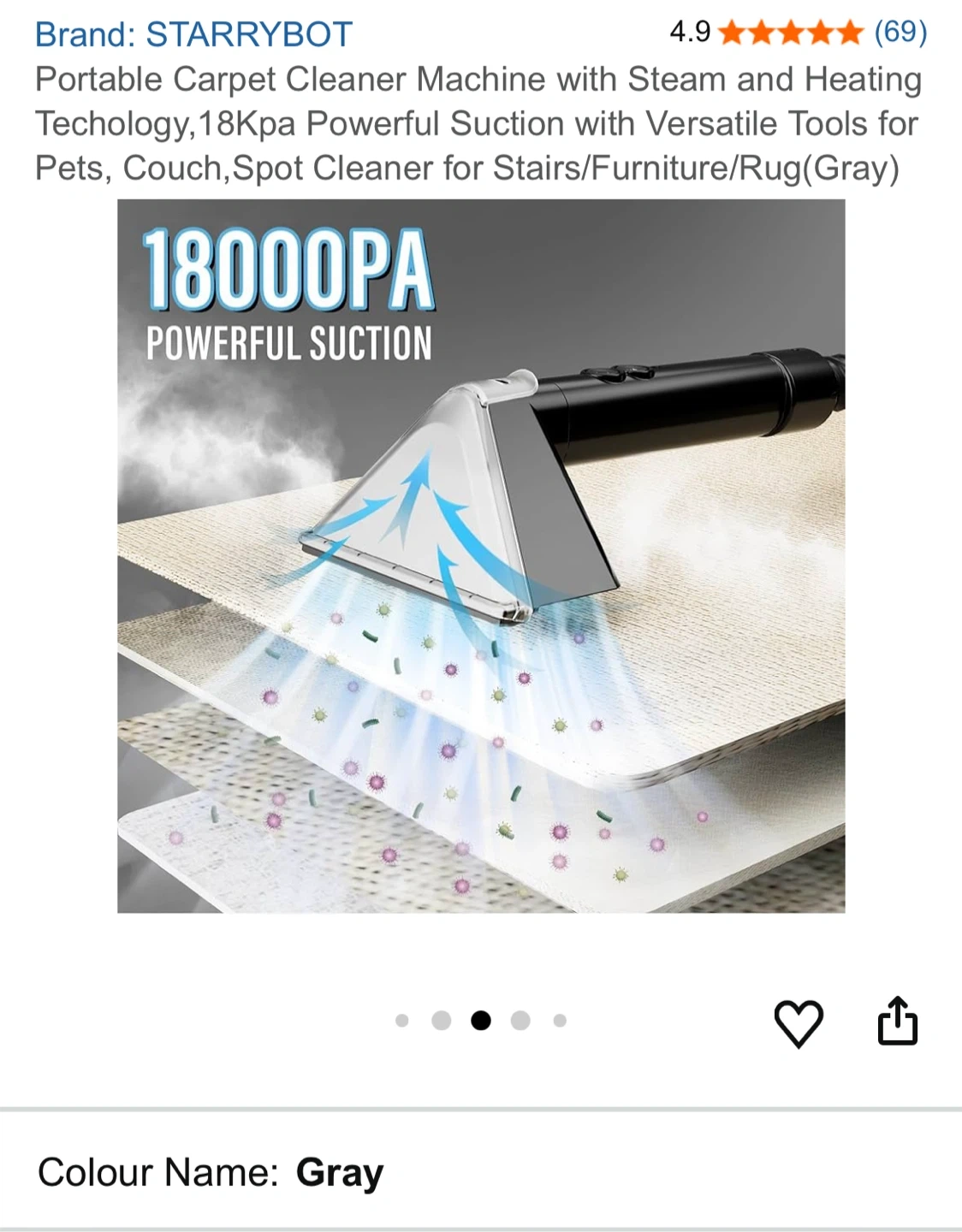STARRYBOT portable carpet cleaner with steam and heating techology. It features 18,000Pa powerful suction for effective cleaning. This unit comes with versatile tools for carpets, upholstery, and stairs. It's great for tackling stains from pets and everyday messes!