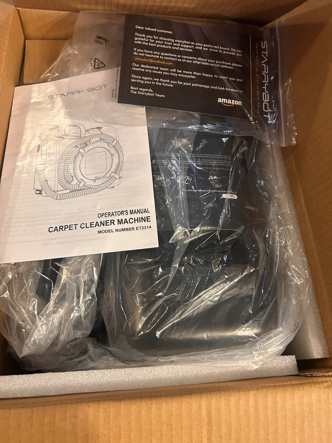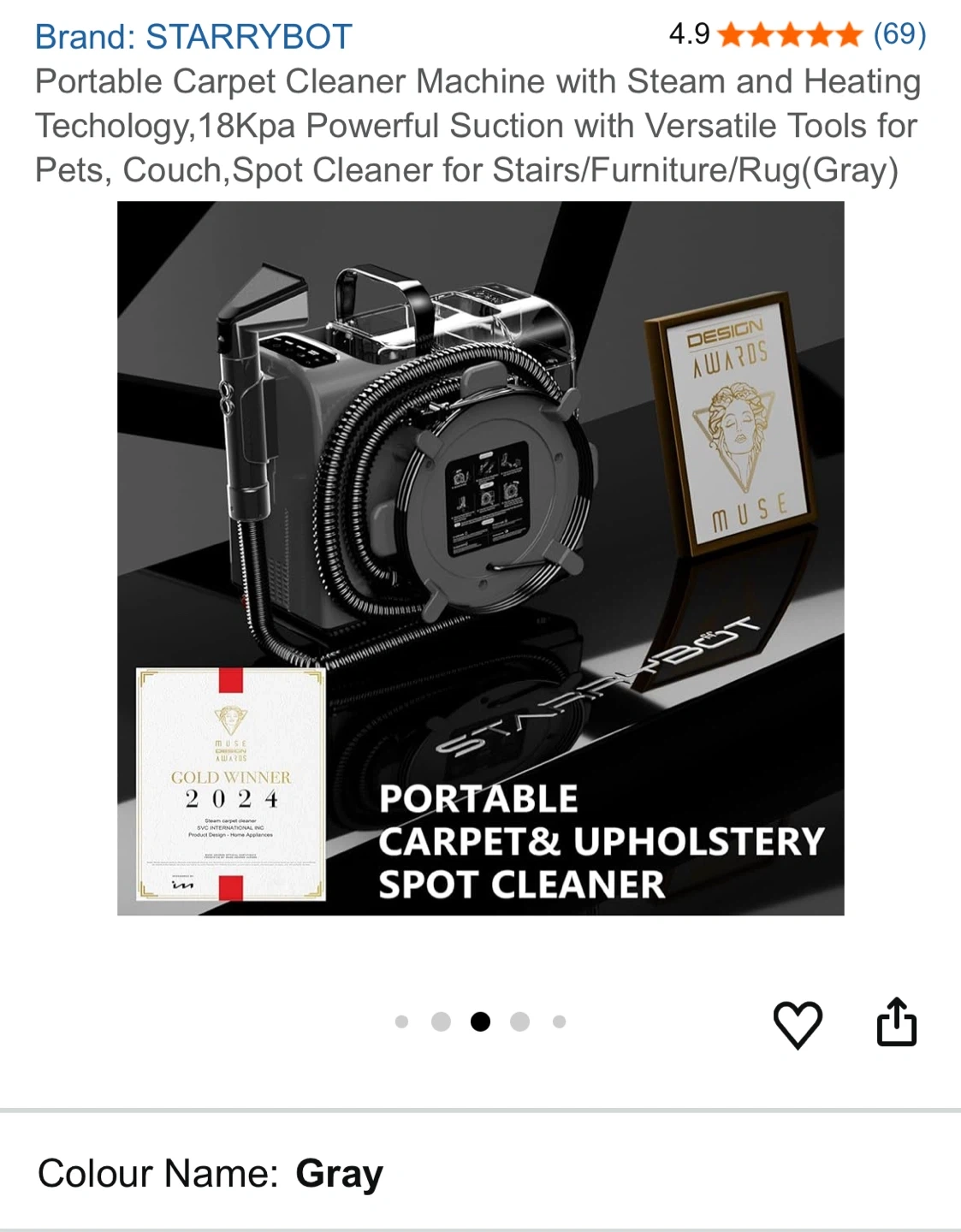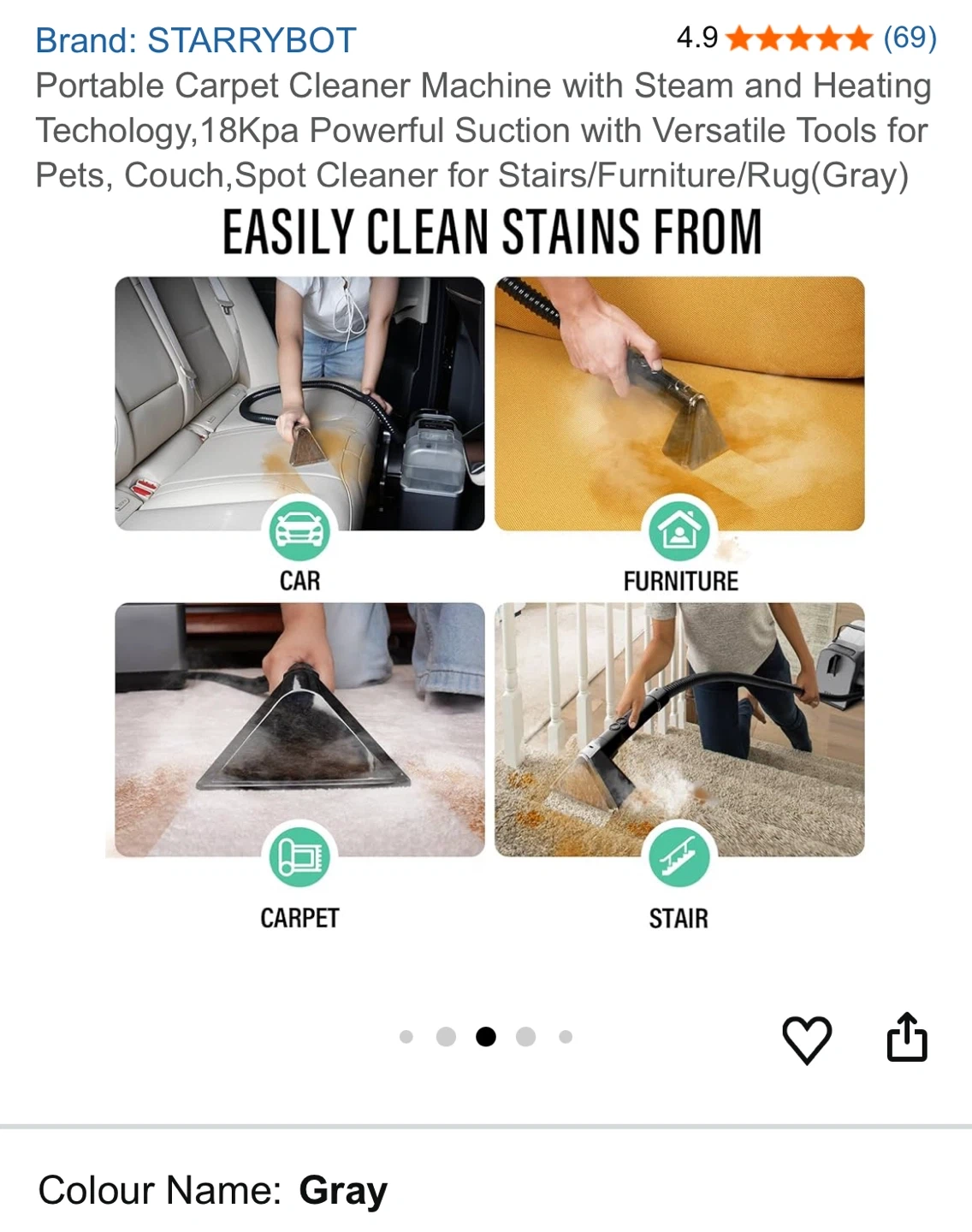 STARRYBOT portable carpet cleaner with steam and heating techology. It features 18,000Pa powerful suction for effective cleaning. This unit comes with versatile tools for carpets, upholstery, and stairs. It's great for tackling stains from pets and everyday messes!