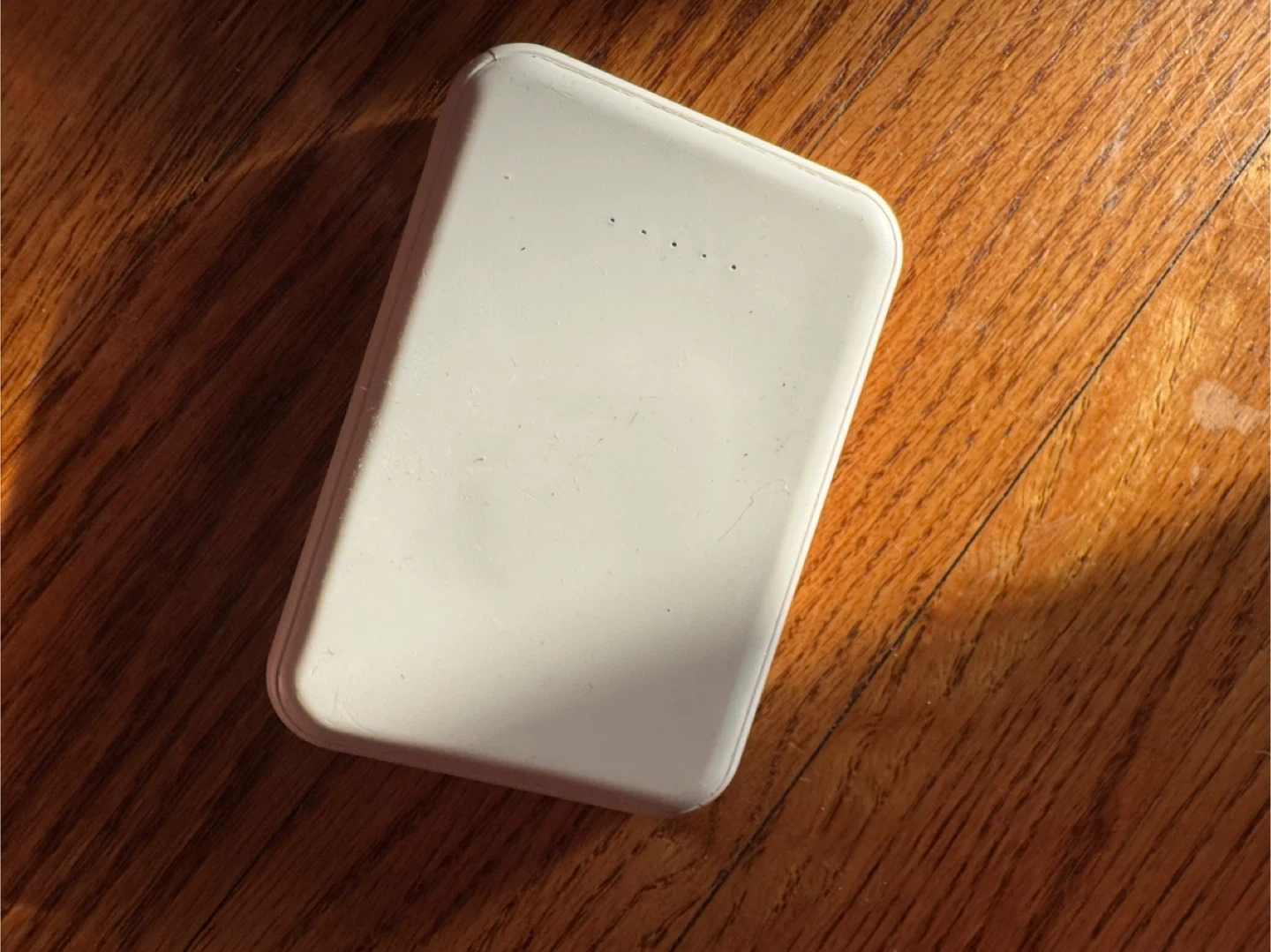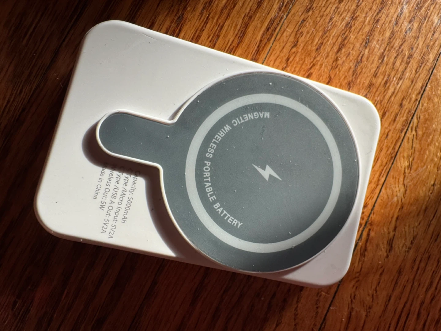 This is a portable magnetic wireless battery charger. It has a capacity of 5000mAh. The input is Type-C and it has USB-A output. It's made for easy on-the-go charging!
