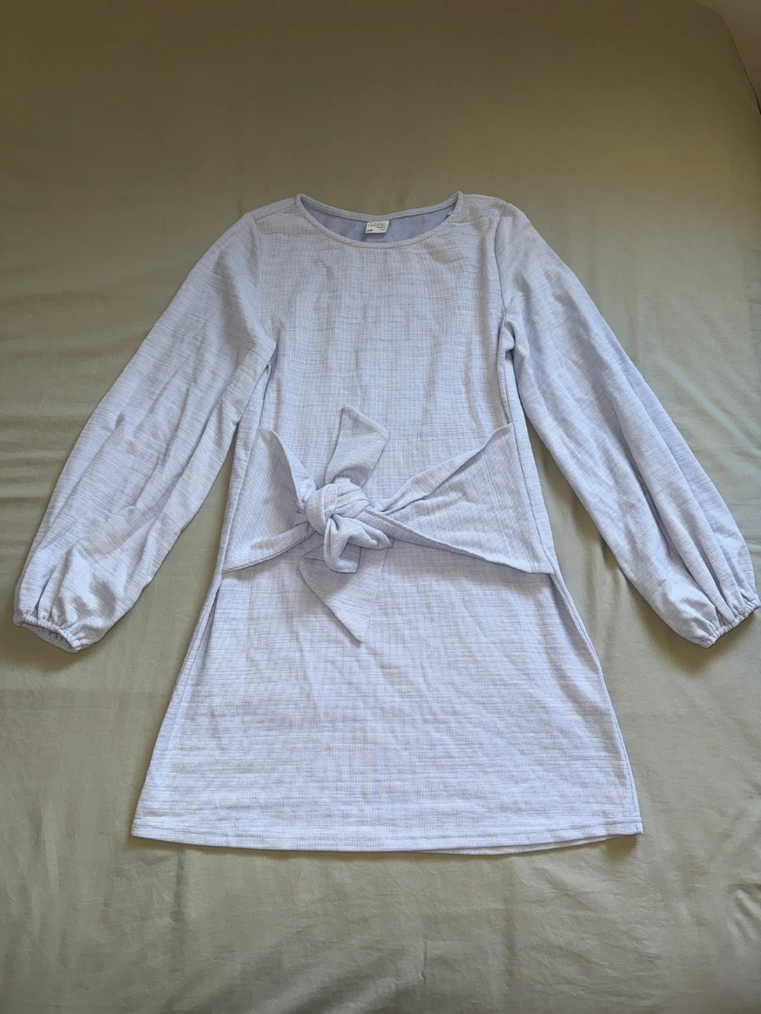 Here's a lovely light blue mini dress with long sleeves! It features a tie at the waist for a flattering fit. Perfect for a casual day out or a special occasion