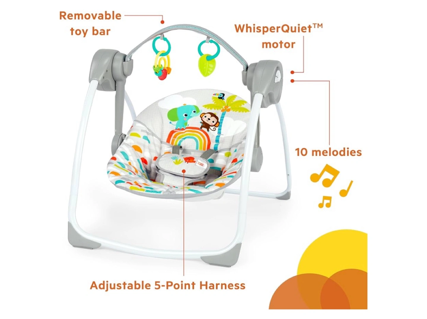 Bright starts Portable Swing is in great condition! It features a removable toy bar, a WhisperQuiet motor, and 10 melodies to keep your little one entertained. It also has an adjustable 5-point harness for safety and converts to a seat