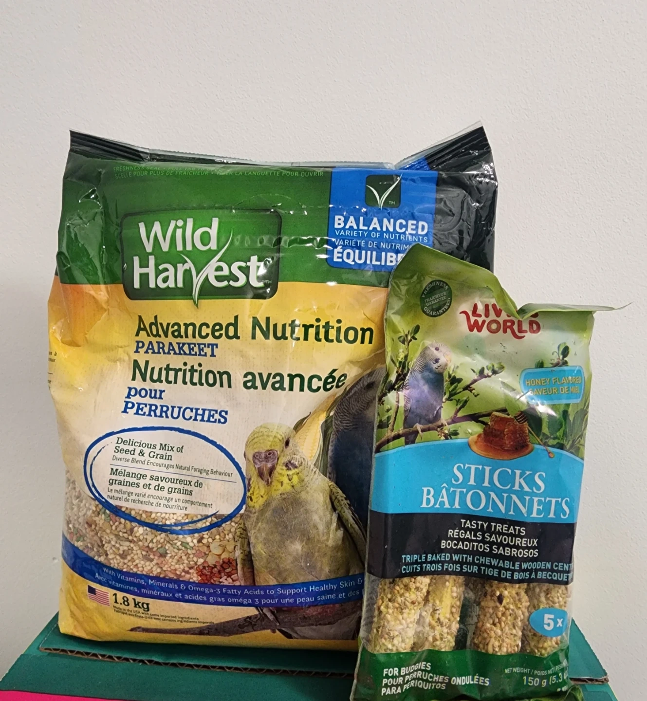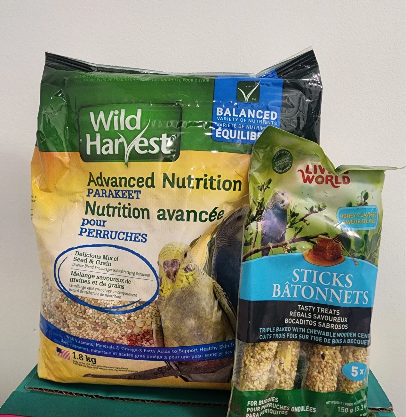 Wild Harvest Advanced Nutrition parakeet seed and grain mix. Includes Liv-World honey-flavoured parakeet sticks. The large bag is 1.8 kg, and the sticks are 150 g (5 count). This food supports healthy skin and feathers with vitamins, minerals, and omega-3 fatty acids.