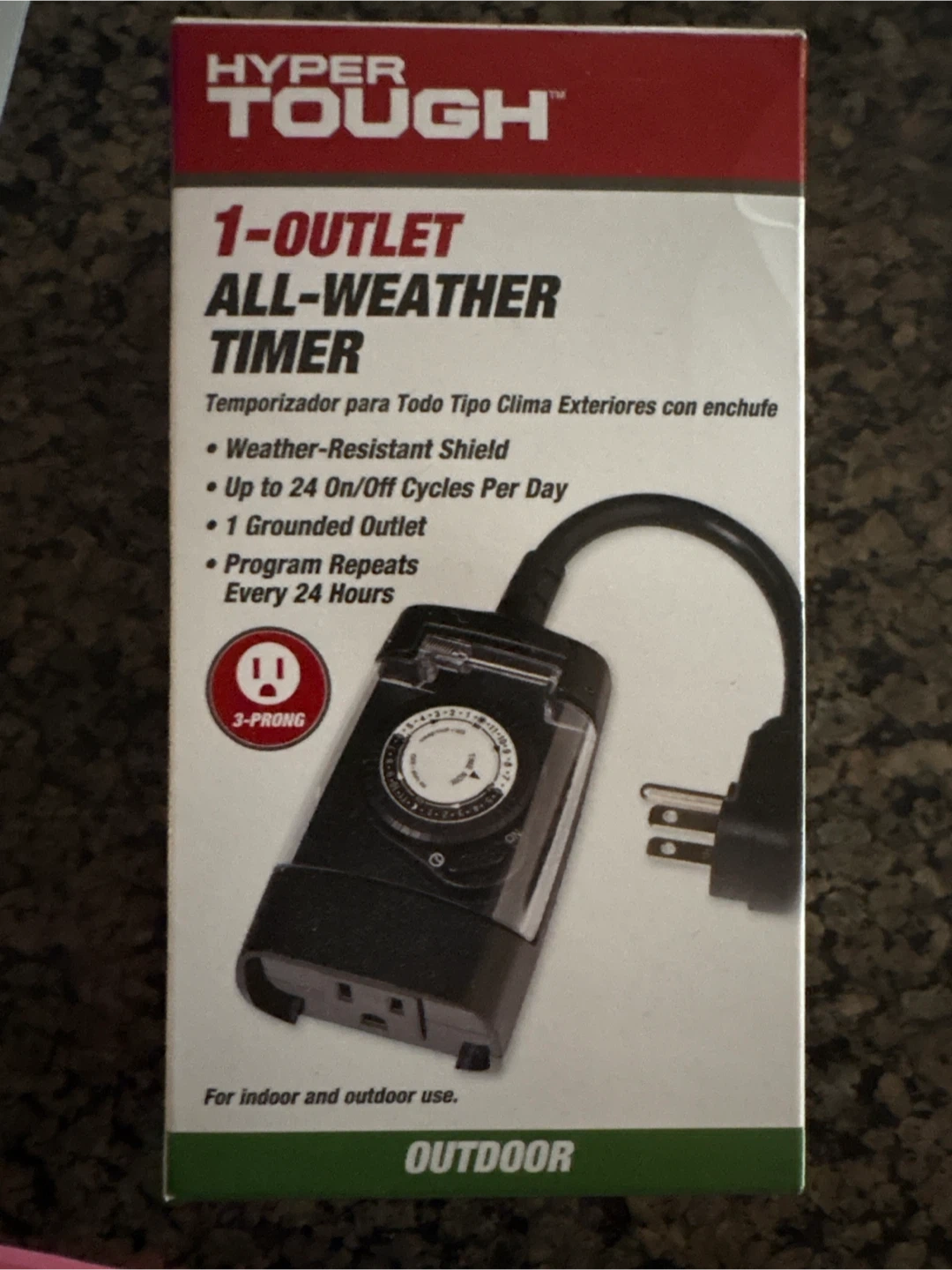Selling a brand new Hyper Tough 1-Outlet All-Weather Timer. It features a weather-resistant shield and can handle up to 24 on/off cycles per day. It also has 1 grounded outlet and a program that repeats every 24 hours. Great for indoor and outdoor use!