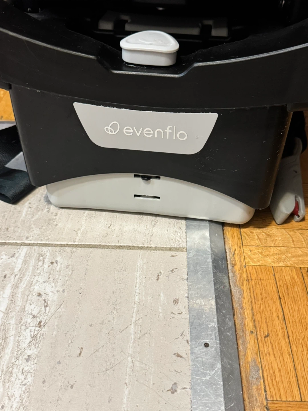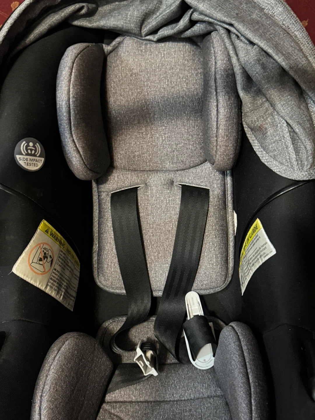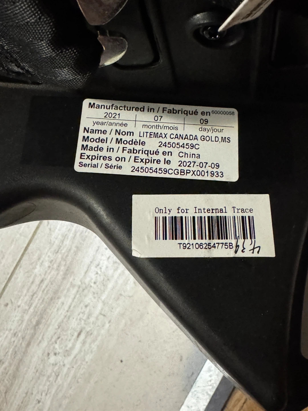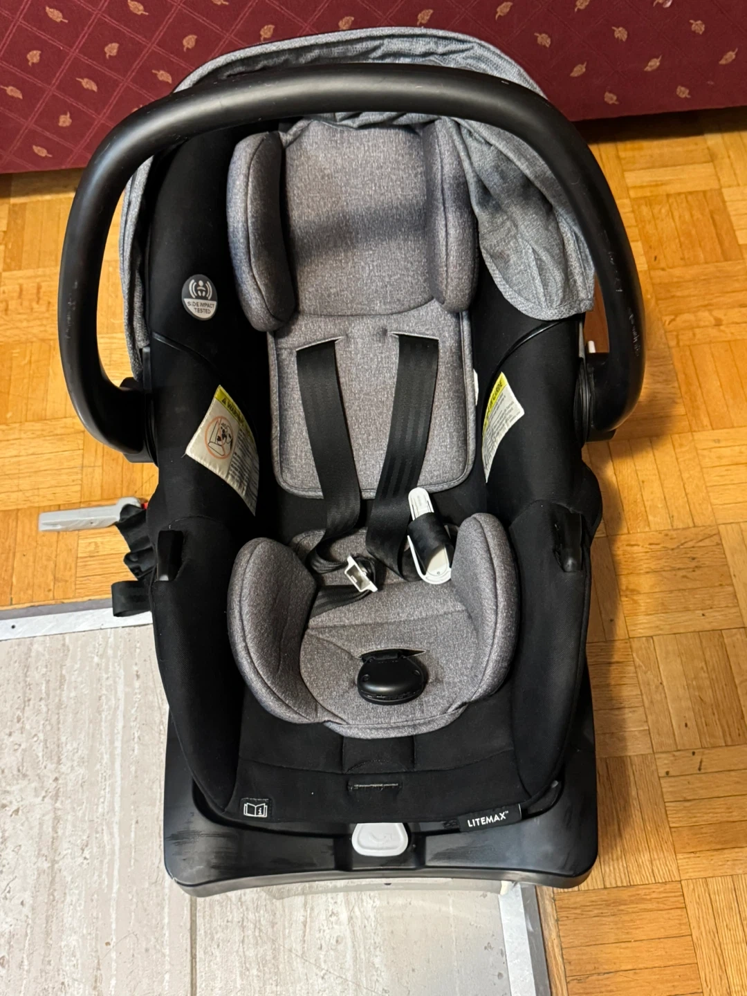Evenflo Litemax infant car seat in gold and black. Manufactured in 2021 and expires in 2027. It's side impact tested and has a recline indicator for different weight ranges. Suitable for babies weighing 1.8-9 kg (4-20 lbs) and 9-15.8 kg (20-35 lbs).