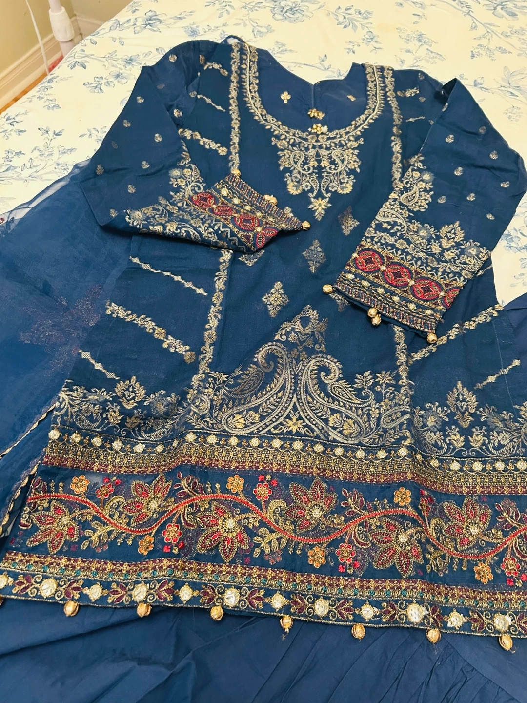 Beautiful navy blue embroidered salwar kameez set. It's adorned with intricate gold and red thread work and small bead embellishments. The set includes a kameez, matching pants, and a sheer dupatta.