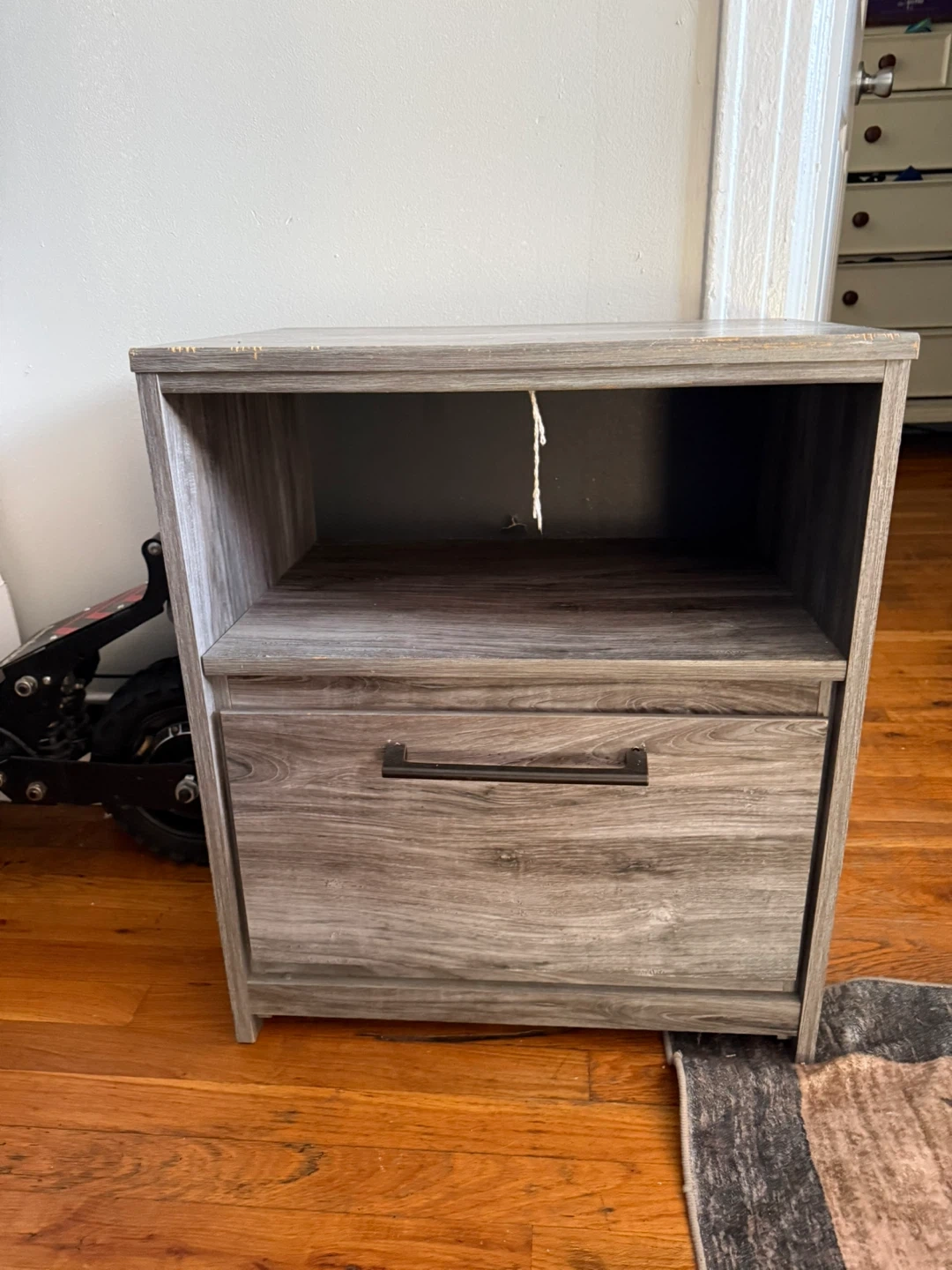 This woodgrain storage cabinet features an open shelf and a drawer with a metal handle. It has a distressed wood finish. Its compact size makes it a versatile storage solution.