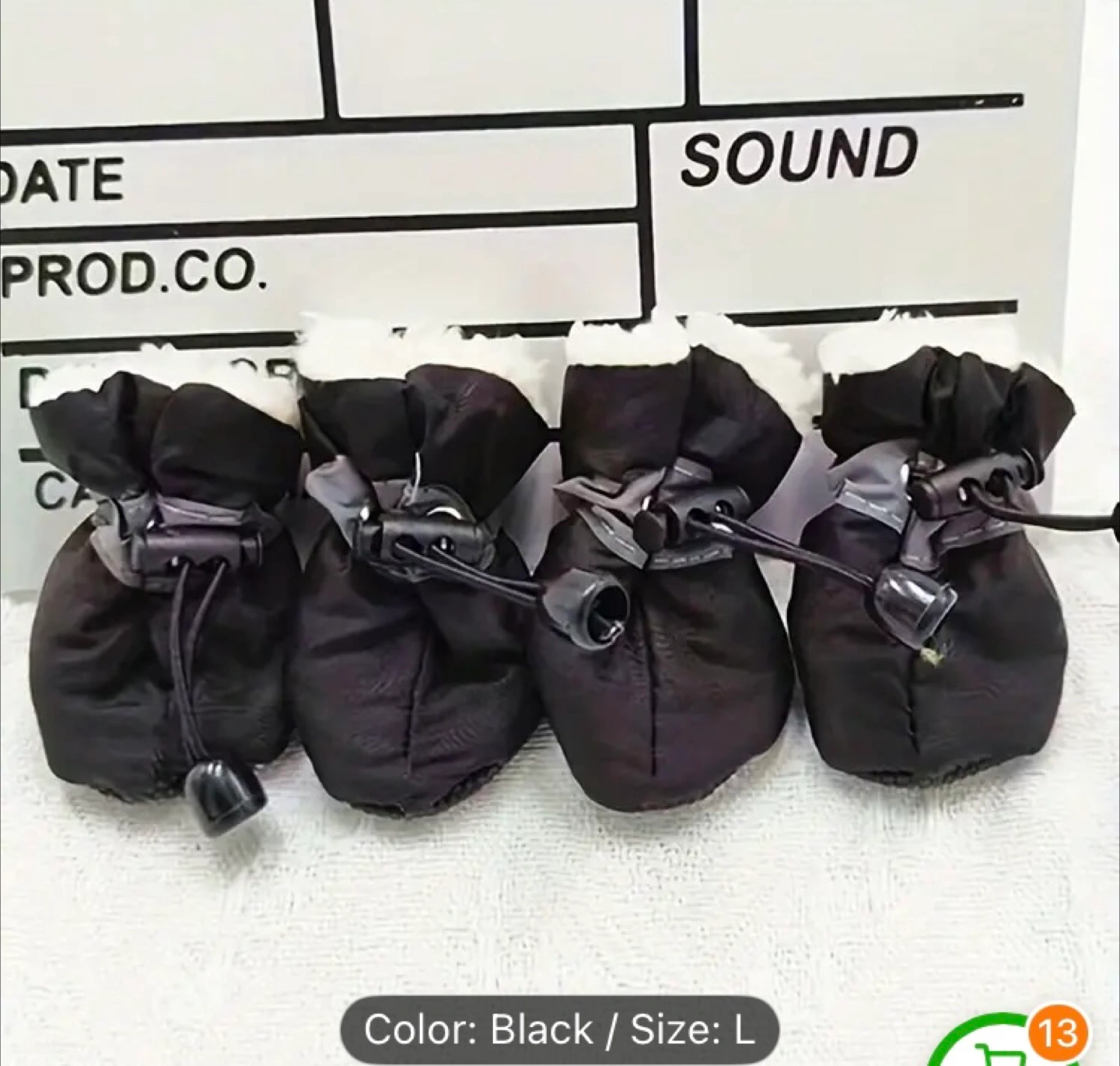 These are black dog booties in size L. They're made with a durable outer material and feature a soft, furry lining for comfort. The adjustable straps ensure a secure fit for your pet's paws. These booties are useful for protecting paws from rough terrain or extreme weather.