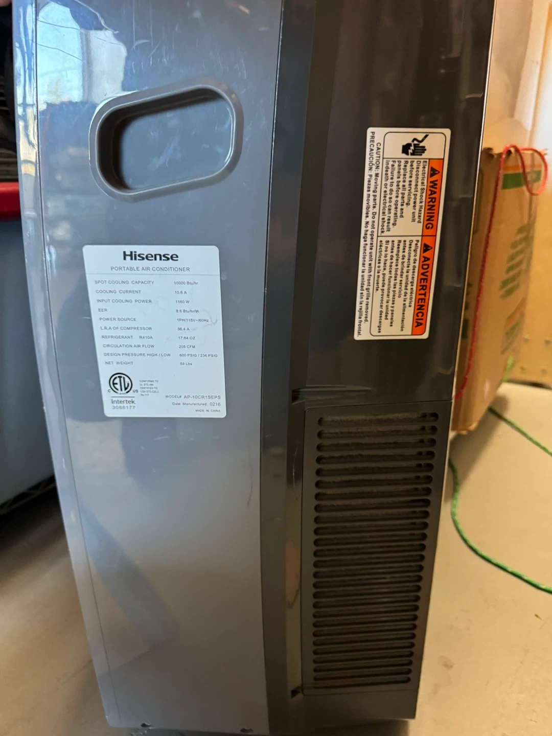 This Hisense portable air conditioner offers 10000 BTU cooling capacity and 1180W power. It features a 17.6 GPM water flow rate and 124 CFM air circulation. The unit includes multiple modes like cool, fan, and sleep. It's a great addition for keeping a room comfortable during hot weather!
